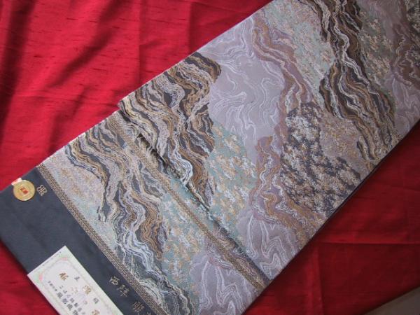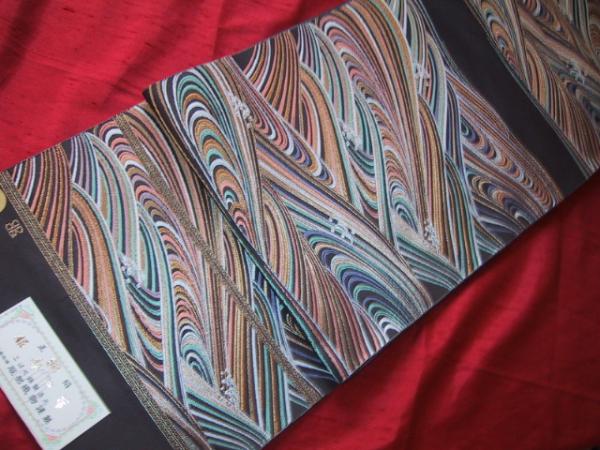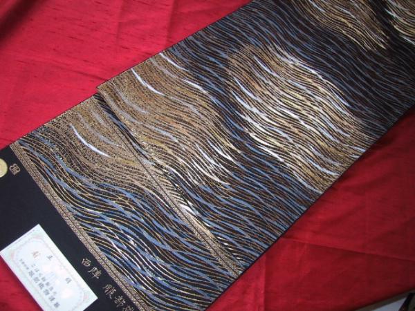 波--3本から選べます--。パンフレットつきの販売袋帯と違い、1本1本が名門機屋の200有余年の歴史の重さをうけついで、織られています。今回はその織屋さんのの中でも、個性的な波(上から順に、黒、焦げ茶、濃いグレー地)帯を3本から1本選んでいただきたく出品いたしました。1本のお値段です。3本ともご入用のかたはいないと思いますが、3本ご入用の方は、『入用数1x落札金額+入用数2x123000円』でお譲りできます。新品み仕立て品。絹100%金属糸等使用