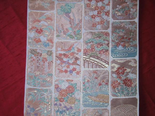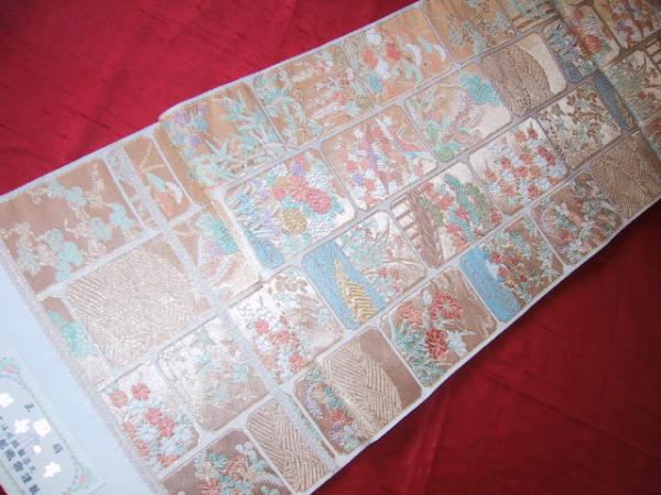 ”かるた”に織り込まれた花が上品です。西陣の歴史ある織り元だけに、しかりした図案で”かるた”にちりばめられた花たちが上品にまとまっています。出品は1本です。絹100%金属糸等使用 六通柄袋帯で、新品未仕立て品です。地色はしろ色です。質問などお気軽にどうぞ!