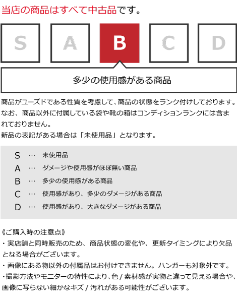 | 当店の商品をご覧いただきまして、ありがとうございます。 目立った汚れ、ダメージはございません。 店頭でも同時販売しておりますので、記載にない汚れ、ダメージ等がある場合がございます。 その他にご不明な点がございましたら、店舗までお尋ねください。 |