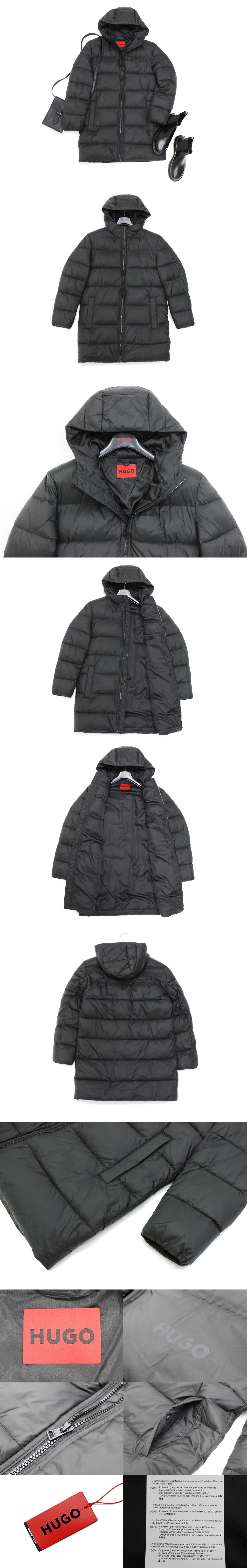 18万新品◆S◆BOSSヒューゴボス ロゴ入りフード付き 撥水キルティング中綿入りロングナイロンジャケット ブラック黒