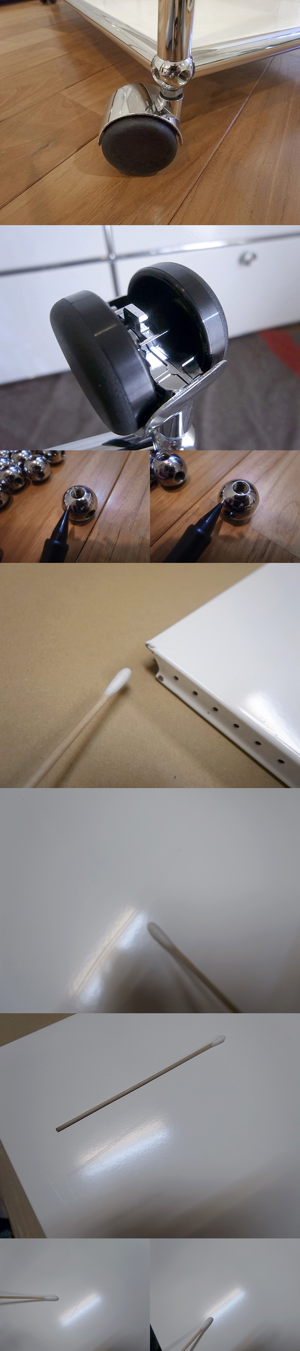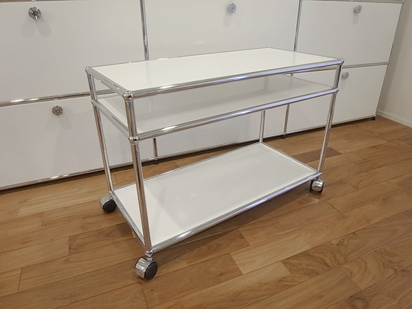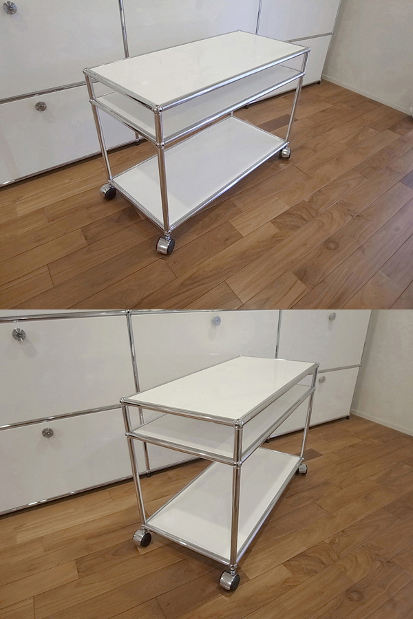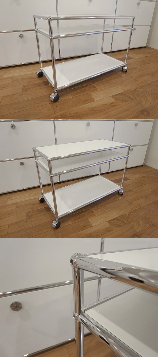 ご覧いただきましてありがとうございます。 建築家・フリッツハラーによる収納システムUSMハラーシステム[中古品]です。 チューブとボールジョイントのきわめてシンプルな部材構成により、さまざまなユニットを形づくることができます。 こちらは中古で出ることもめずらしいプリンタ台/スキャナ台です。 通常のデスクワゴン(ユニットF/ロールボーイ)仕様のモデルよりも奥行のあるパネル(750mm×350mm)を使用しておりますので、A3サイズのプリンタなども設置可能です。 パネル間の隙間(高さ)は、上段8cm、下段33cm程度です。 キャスターつきの取り回しのよい仕様ですので、キッチンワゴンや小物の収納など、用途は無限に広がります。 パネルのカラーは人気の「ピュアホワイト」です。 遠目から商品全体を写した画像は、過去に出品をしました同一商品の画像を転用しております。キズや使用感など、コンディションのご説明をする上で、特に問題はないと判断しています。 ペンでキズを指し示した画像は、現品を撮影したものです。 コンディションですが、中古の状態で入手をしたものですが、特に目立つ大きなキズや使用感もなく全体的に良好です。 中段パネルに、間近で見るとやや目立つ浅い線キズがございます。ピッチが狭いため、視覚的には目立たず、ご使用時に気になることはなさそうです。 キャスターは4点とも新品です。(きれいな床上を多少転がしています) 大型のユニットを分解し、再構築したユニットのため、ボールの各面に、チューブとの接触でついたリング状のキズ(圧迫痕)がございます。メッキが剥がれるような大きなキズはなく、間近で見るとわかるようなレベルです。 その他、ボールやチューブに、わずかなスレなどはございますが、表面の光沢などもじゅうぶんに残っており、きれいな状態です。 表面塗装の強いハラーですが、商品の性質上、細かなスリキズは避けられないものです。 目についたスリキズなどはできる限り写真に掲載しましたが、その他気にならない程度の小キズはございますので、あらかじめご了承ください。 |