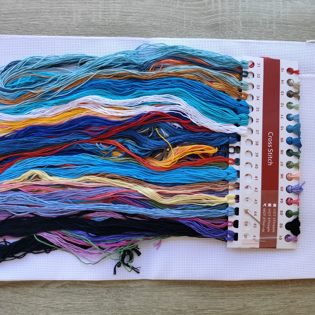 刺繍糸は余分に見積もって入っていますが、製作中もし足りなくなった場合は、ご自身でご用意ください。DMCの糸番号に対応しています。検品のため1度開封しています。
