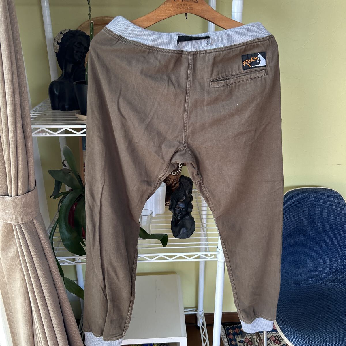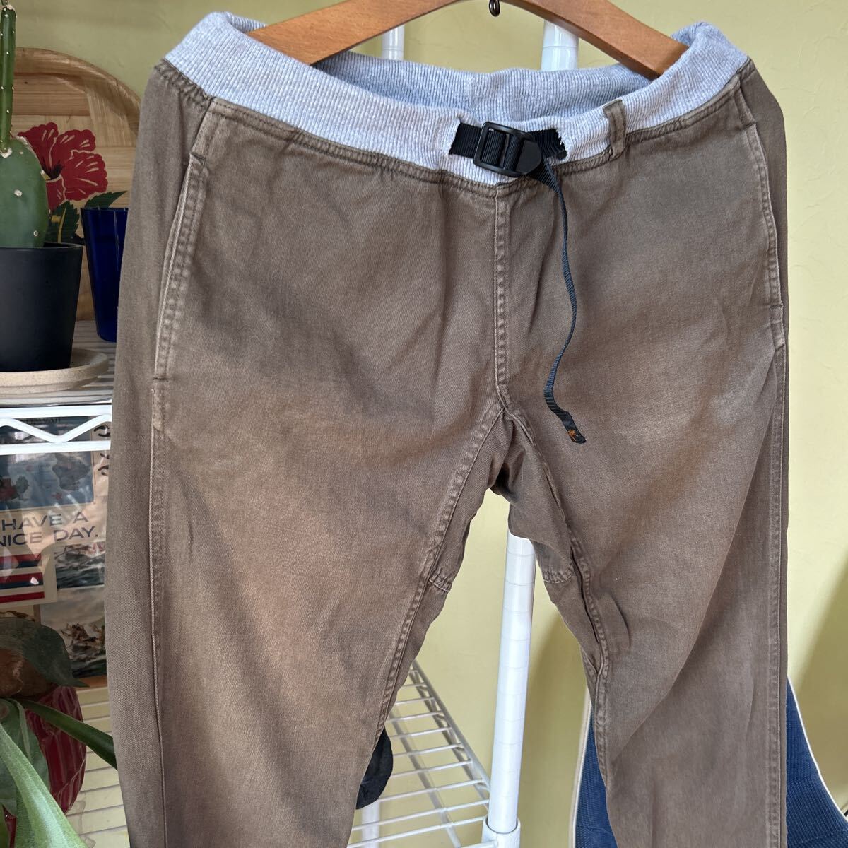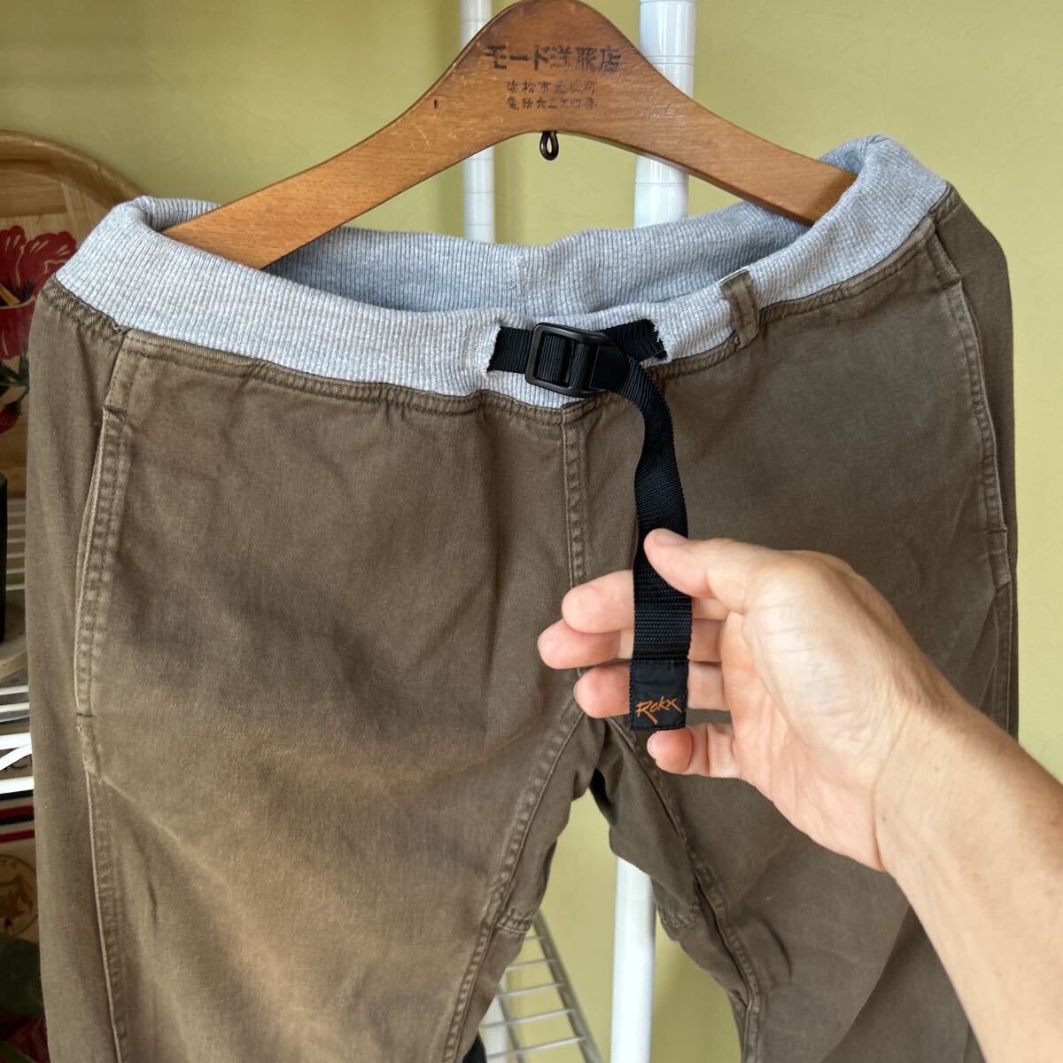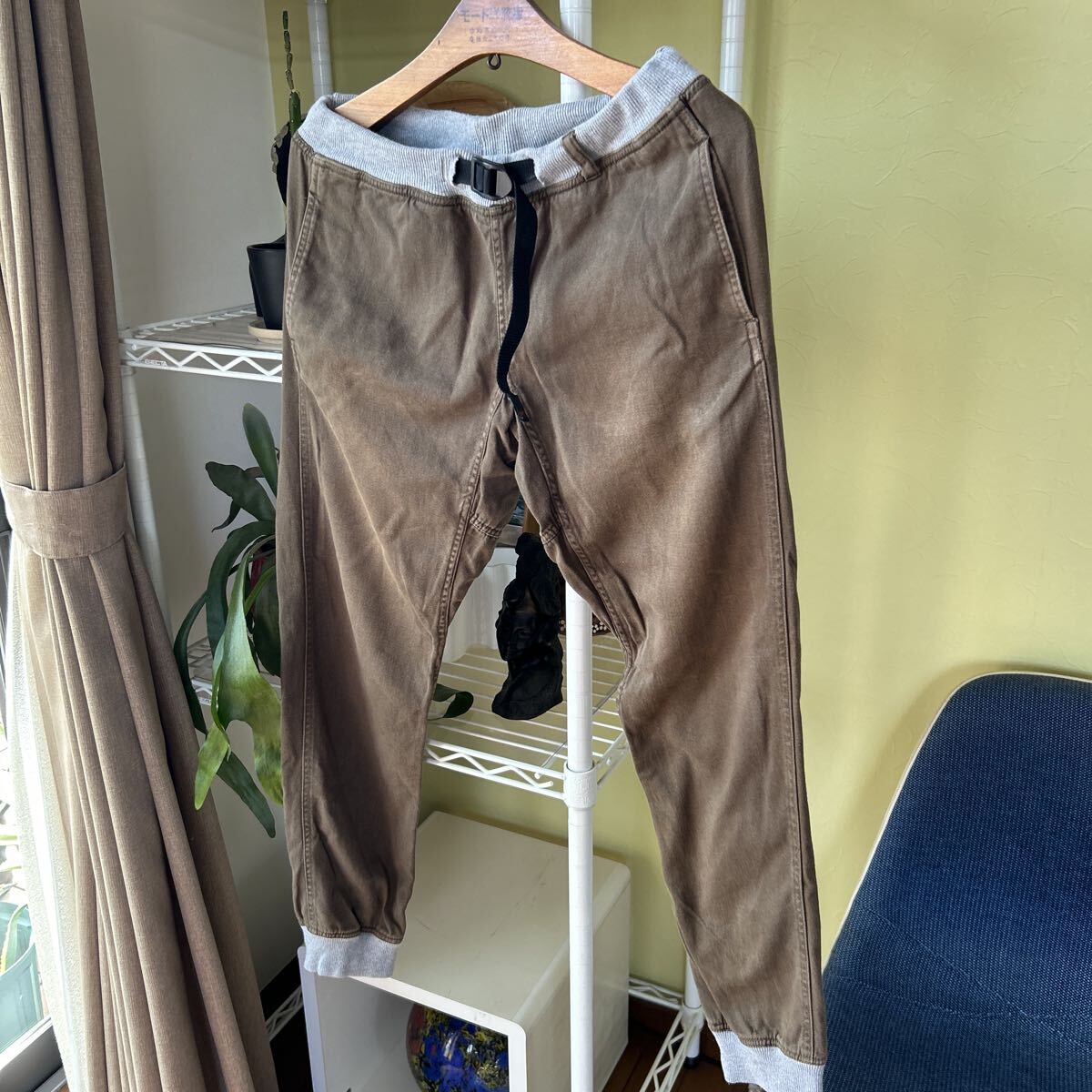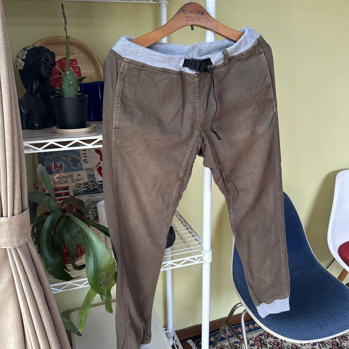 SMくらい 実寸約W〜80くらい〜(平置き)L74(股下縫い目から裾先)総丈97(サイド直線)。多少の誤差はお許しください。多少色落ち感ありますが良い雰囲気です。綿100 リブ付き クライミングパンツ カーキ できる限りダメージは説明させていただきますが、こちらが気づかない程度のわずかなしみ、よごれ、