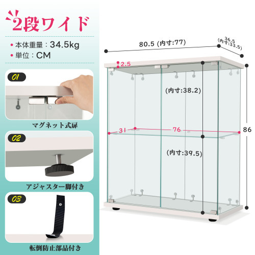 コレクションケース 両扉タイプ 大型 ワイドタイプ ガラスディスプレイキャビネット サイズ:幅80.5×奥行36.5×高さ86cm ホワイト