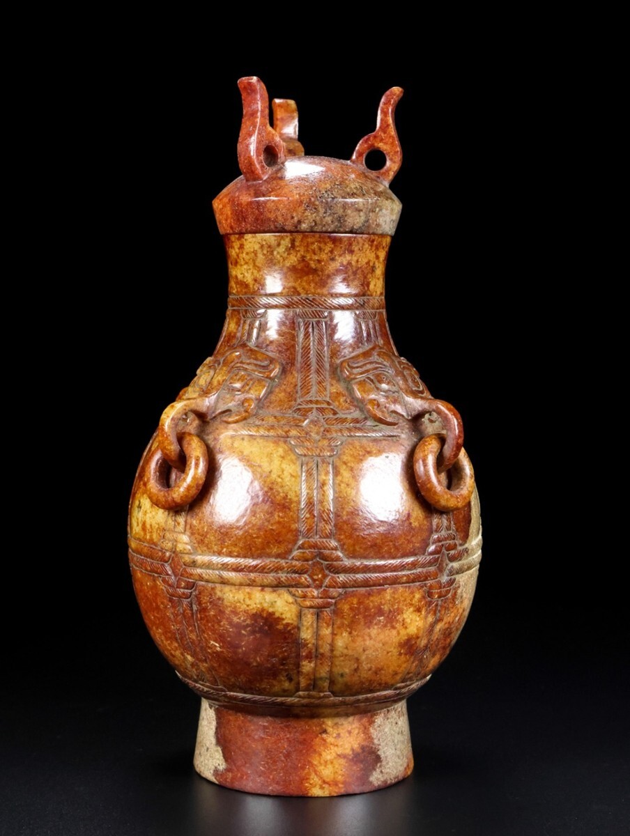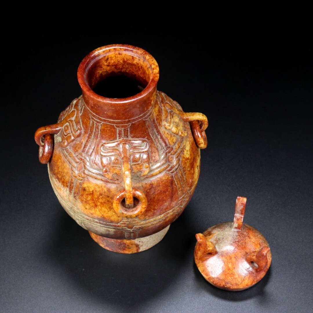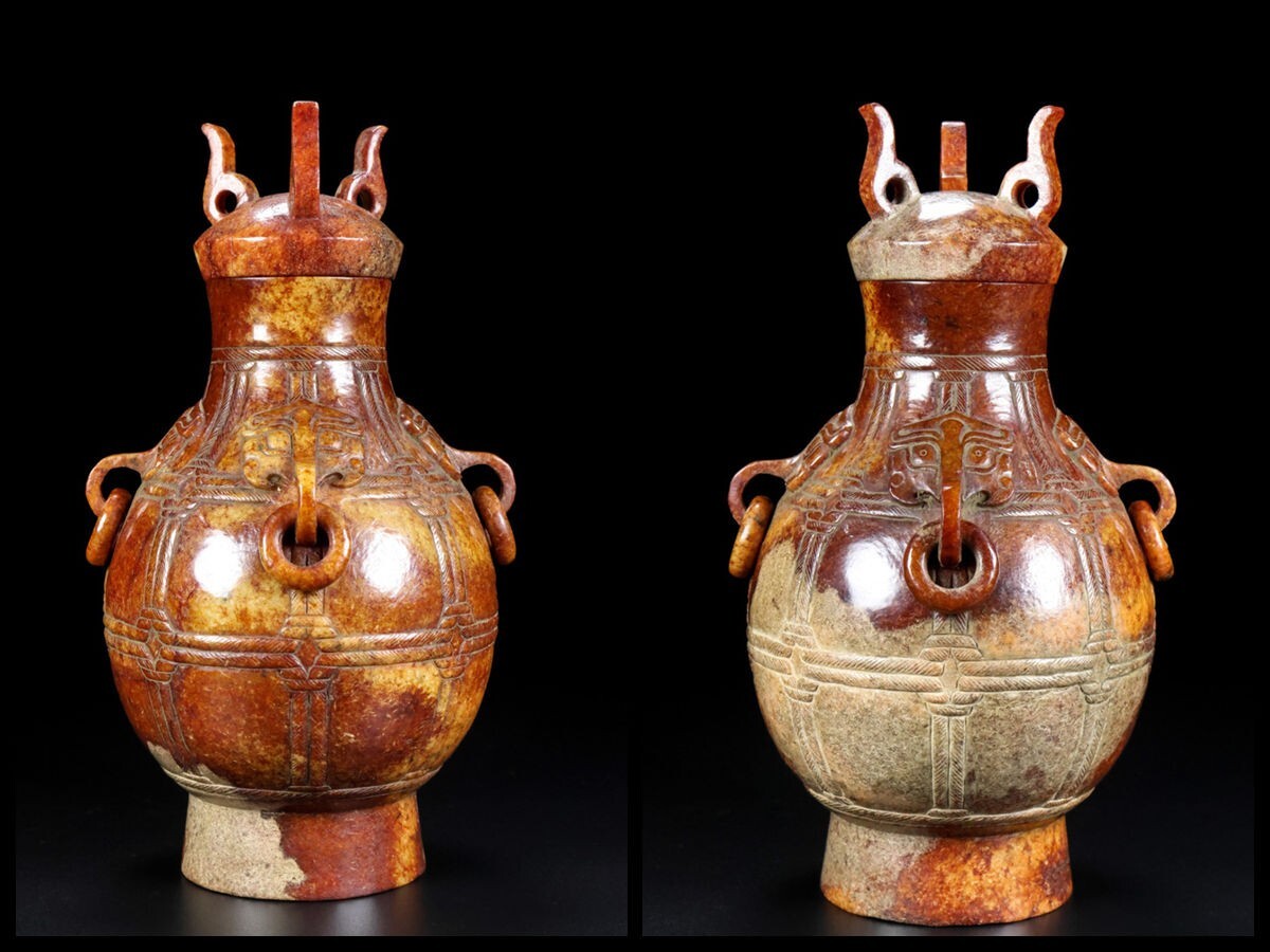 「時代物 和田玉 高古玉彫り 獣面四環耳瓶」極細工 擺件 中国古賞物 古美術 旧蔵出