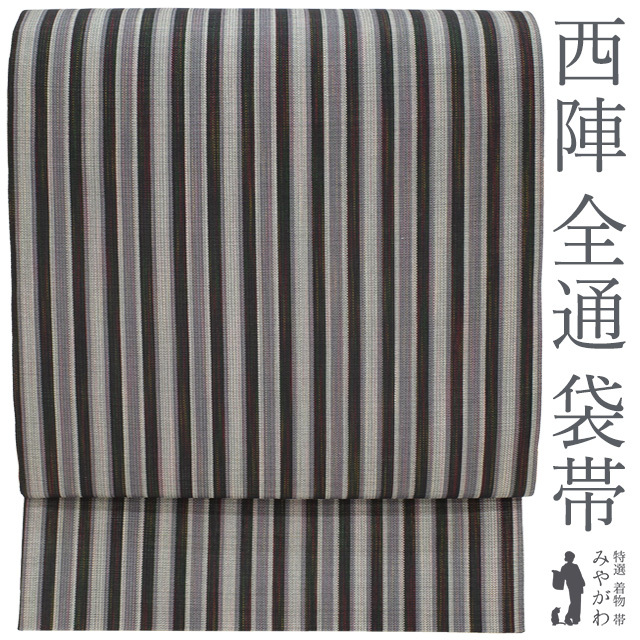 袋帯 未使用 正絹 京都 西陣 全通柄 グレー 黒 縞 ラメ糸 カジュアル モノトーンカラー 春 秋 冬 新古品 仕立て上がり みやがわ sb54614