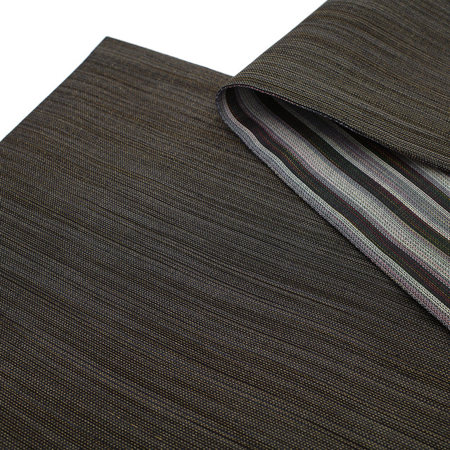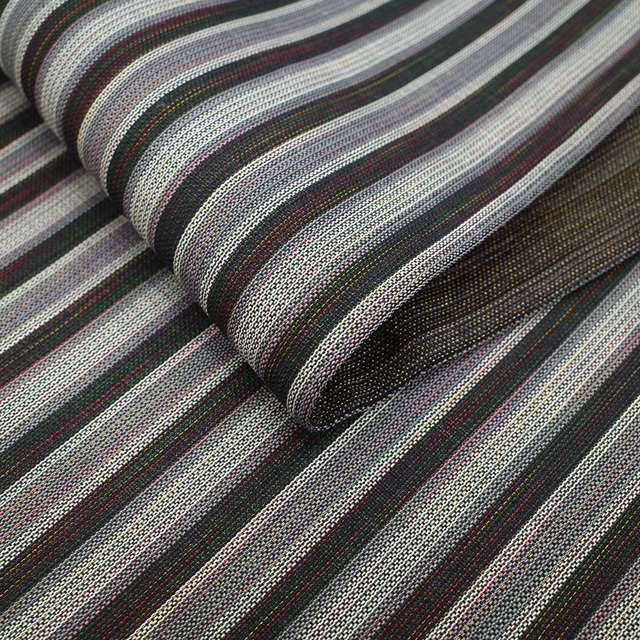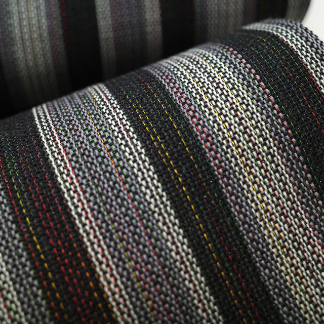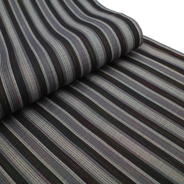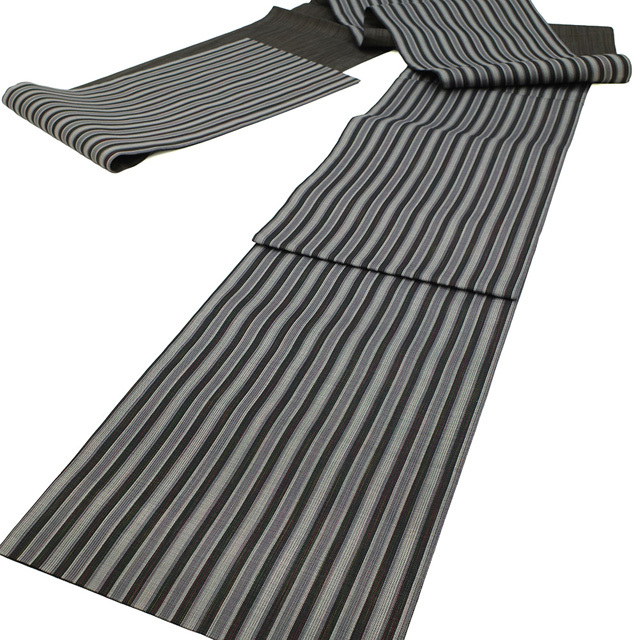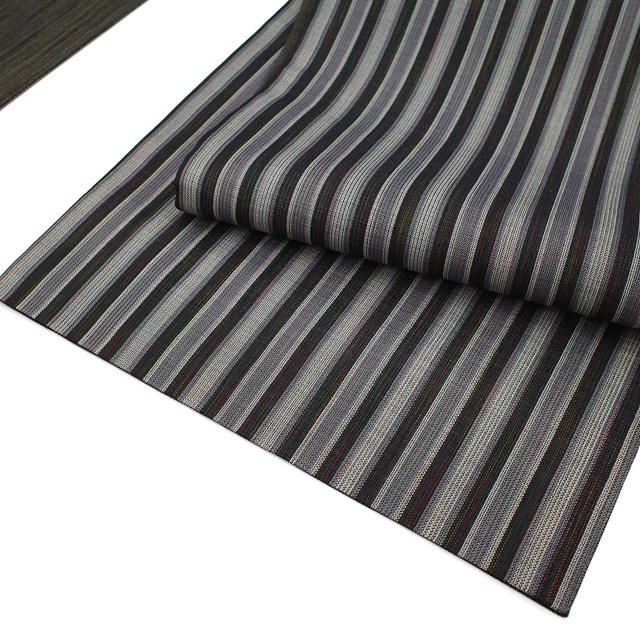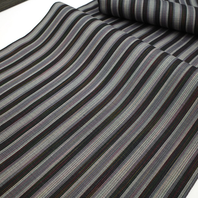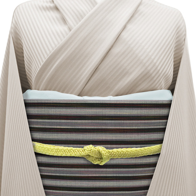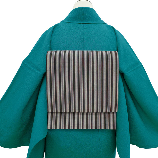 こちらの帯は、シックなグレーと黒のモノトーンを基調とした地に、縞模様が織り上げられたスタイリッシュなデザイン。