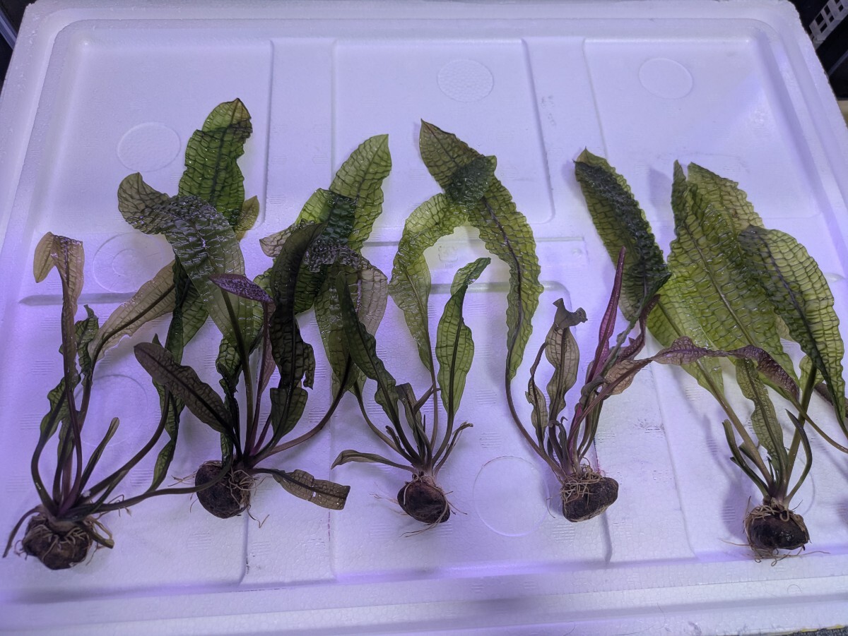 とても丈夫な深緑の美しいロゼット型の水草です。球根(イモ)型の水草なので花芽が出てくると種子を作ろうとして体力を奪われてしまいます。種子が欲しい以外は取り除いてしまいましょう。