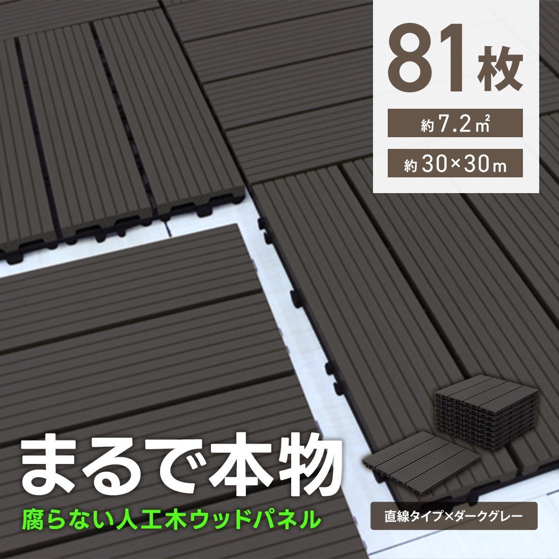 | パズルみたいにサイドの凹凸を繋ぎ合わせるだけで簡単に施工が出来るジョイント式ウッドタイル! ベランダの雰囲気を変えたり劣化してきたベランダの修復に最適! 雨や日差しによる劣化に強く耐腐食性もある人工木を使用。 55%の天然木粉と45%の樹脂で出来ており、天然木製と比べると定期的なお手入れも不要! 小さなお子様やペットにも安心。さらっとした感触でささくれや釘による怪我の心配もなし。 安全に長期間使用できる優れものです! 【商品詳細】 カラー:ダークグレー(直線タイプ) 表面のサイズ(約):幅29.5cm×長さ29.5cm×高さ2cm ジョイント部分も含んだサイズ(約):幅30.5cm×長さ30.5cm×高さ2cm 表面隙間:5mm 重量(約):0.9kg 圧力強度:3000N 材質:WPC素材(木材・プラスチック複合材) 表面・・・人工木(天然木の木粉55%入り) 裏面・・・ポリプロピレン樹脂 【商品内容】 ウッドパネル × 81 |
