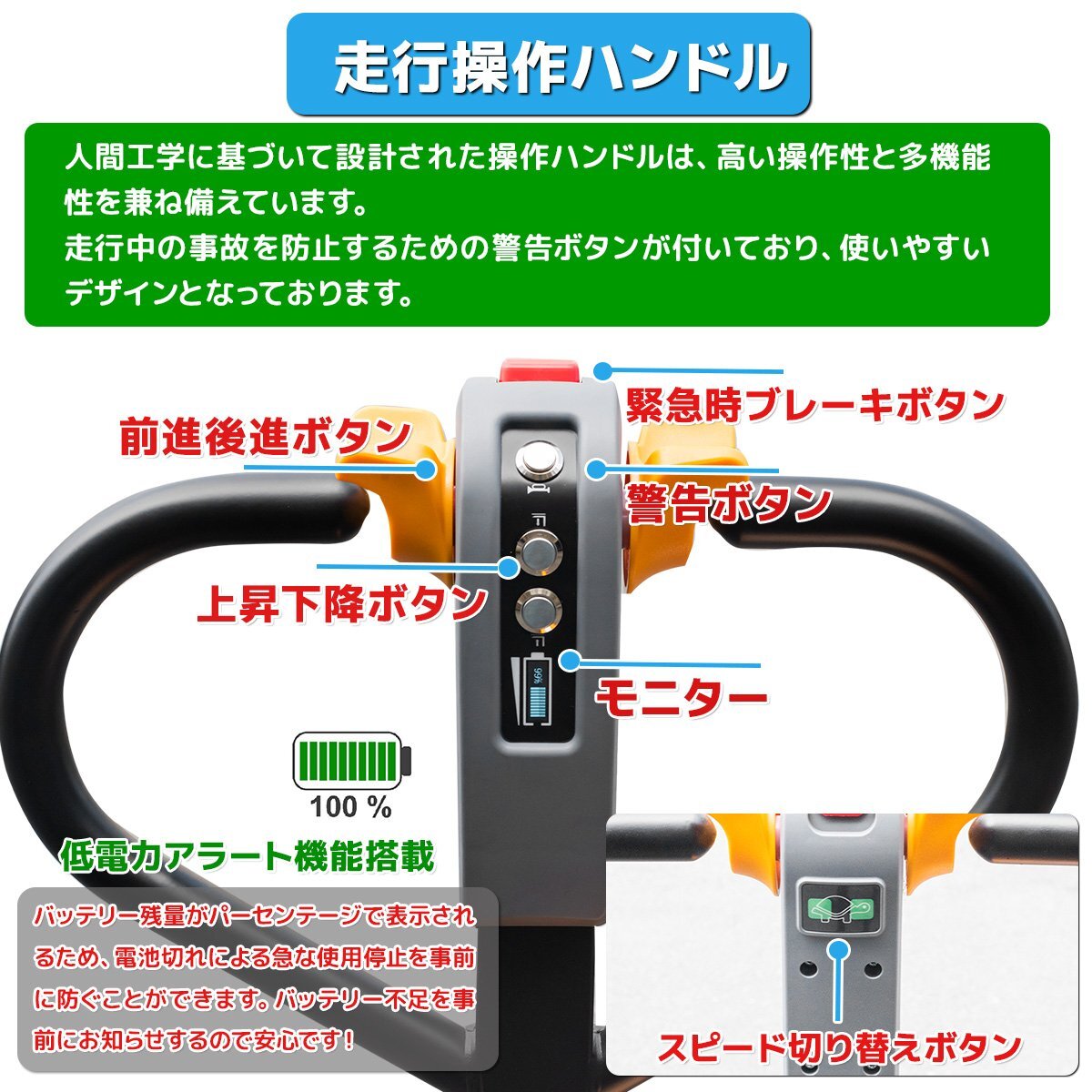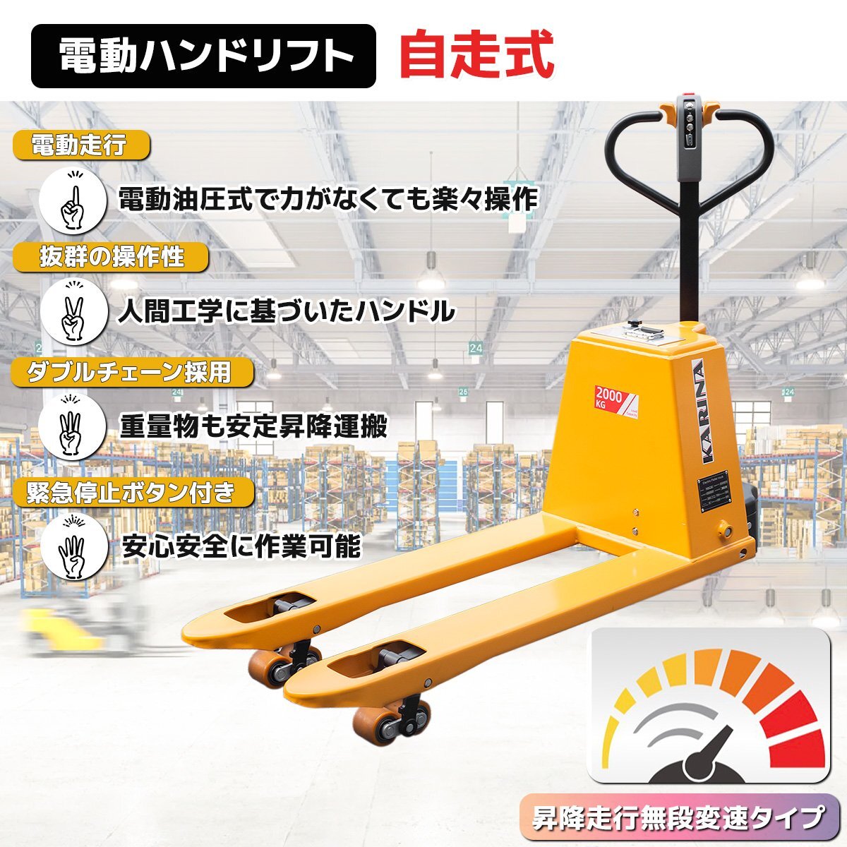 【営業所止め】電動ハンドリフト 自走式 2000kg 電動走行 電動油圧式 無段変速 フォーク幅550mm 充電式リチウムバッテリー 緊急停止ボタン