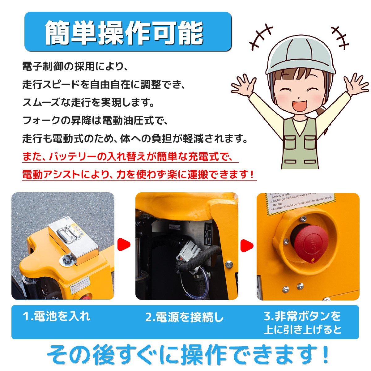 【電動走行&電動油圧式で楽々操作】
