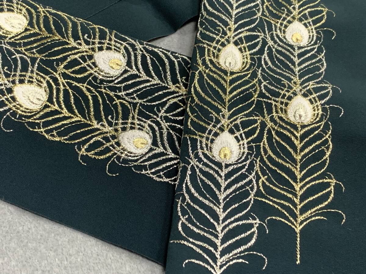 新作入荷★成人式・卒業式★最上級のシルエリー・振袖にアンティーク系半衿【紺グリーン・クジャクの羽柄】