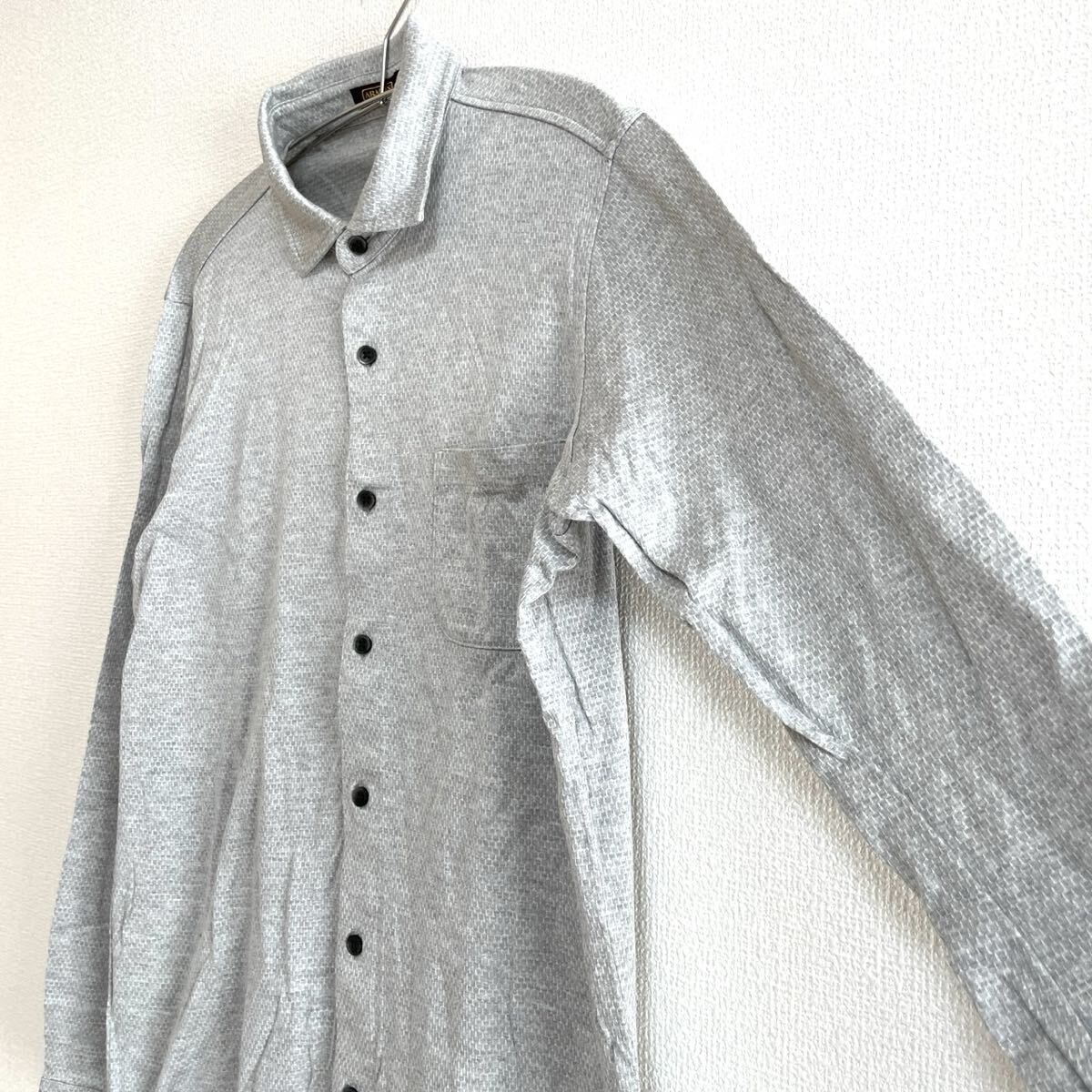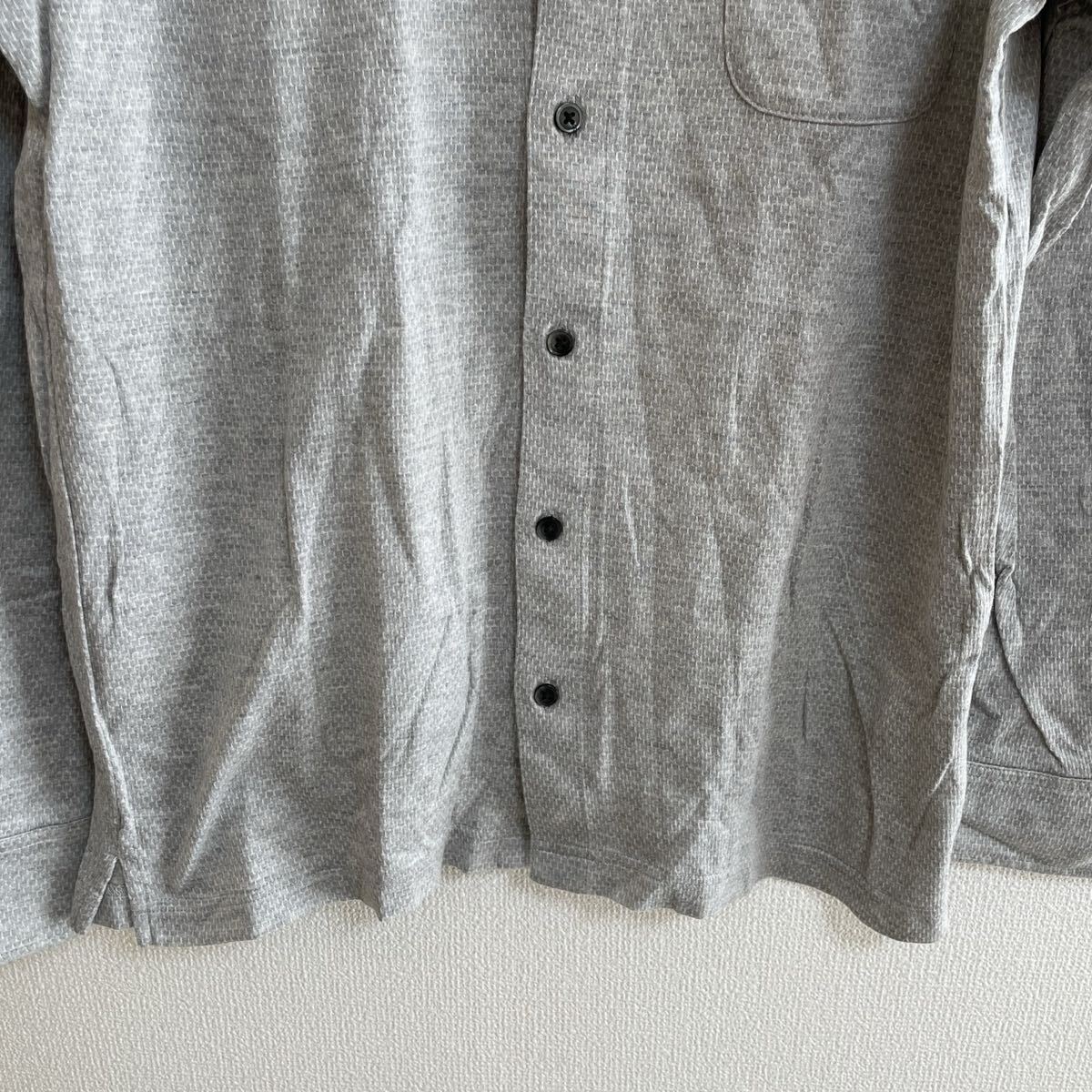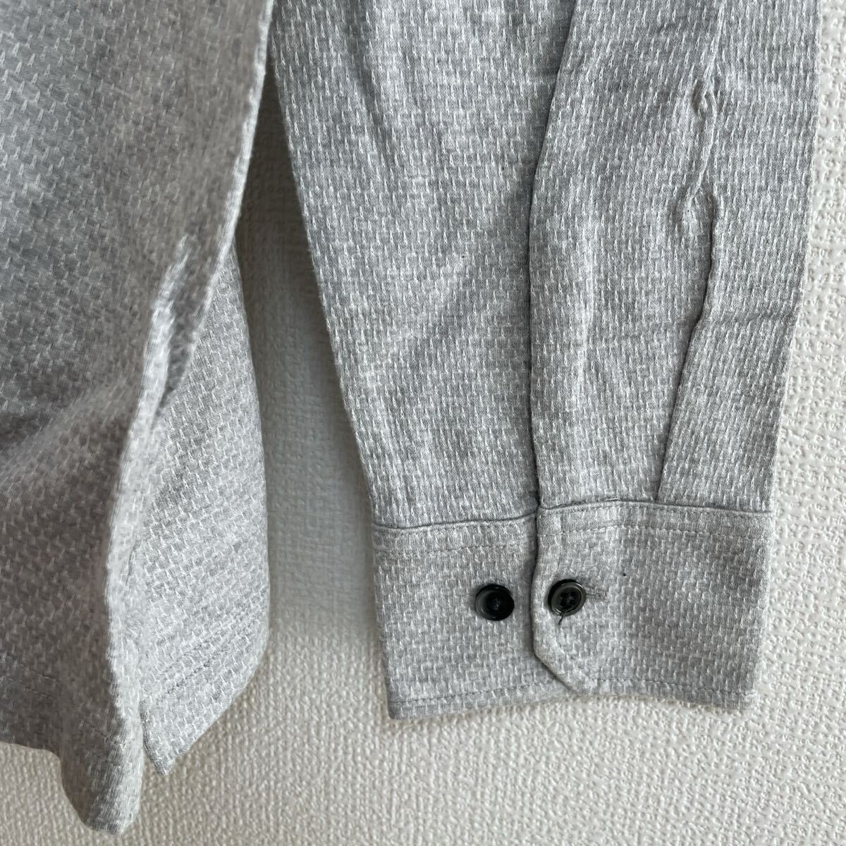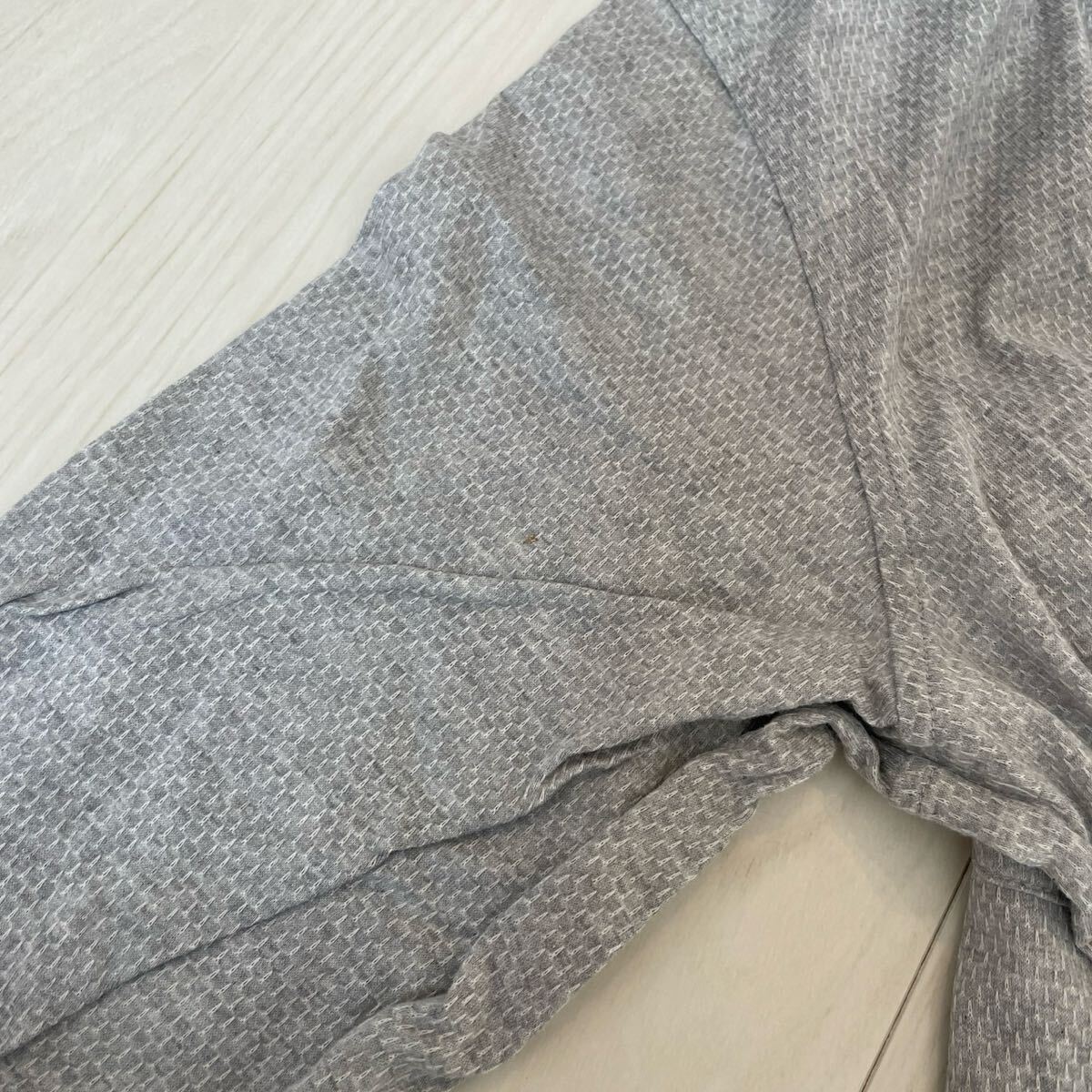 落ち着いたグレーの細かい織り柄が上品な印象で、ビジネスにもカジュアルにも使いやすい一枚です。