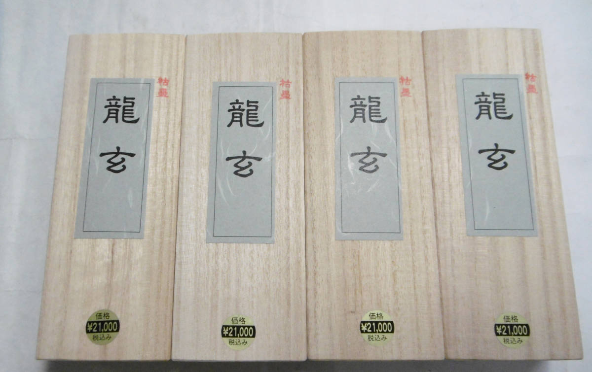 書道用の固型墨 油煙墨「龍玄」5丁型を4本セット完品未使用の出品です。 主に漢字用の墨です。 良い感じに枯れております。 サイズ 約 縦125㎜ 横35㎜ 厚さ15㎜ 約81g 全て新品未使用の桐箱入りです。 土日はヤフオクを見ないので、取引連絡は基本平日になります。
