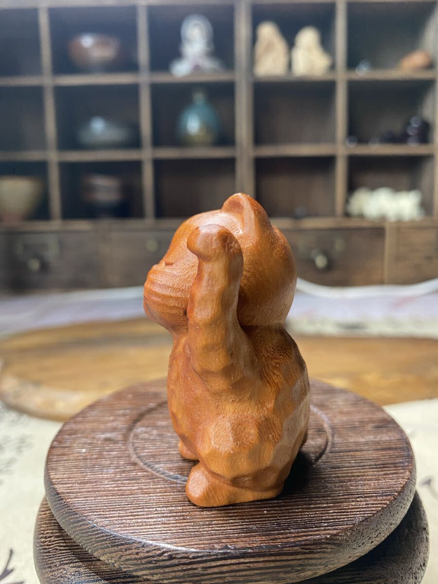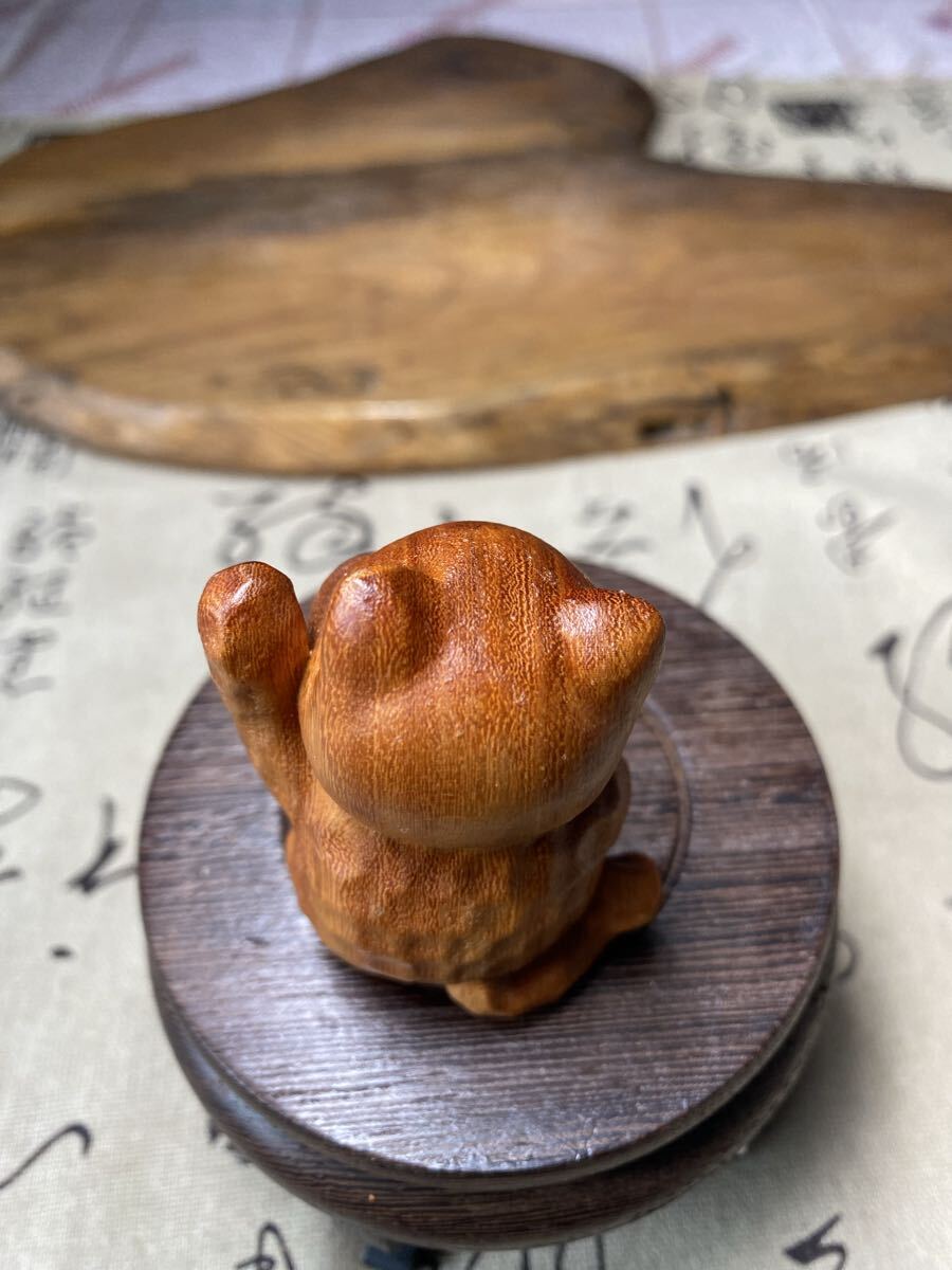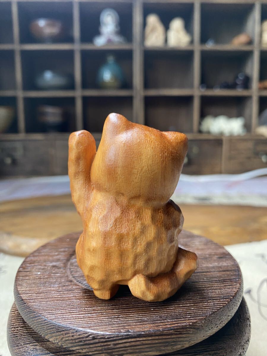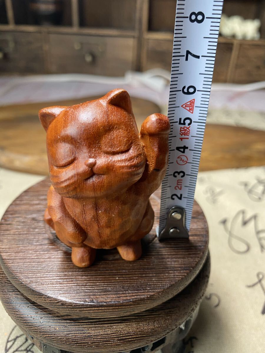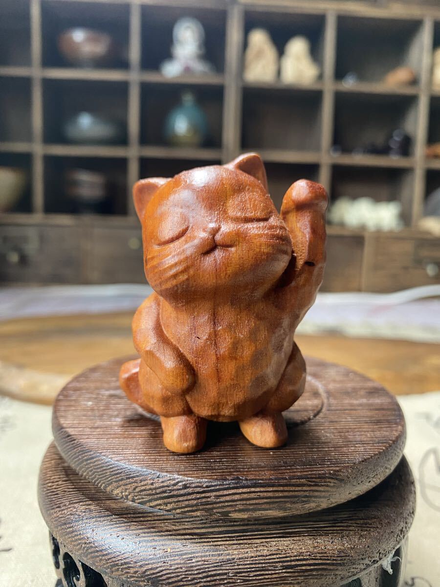 招き猫木彫 可愛い猫一刀彫 リアル繊細彫飾り お守り 贈り物 インテリア風水 古美術 サイズ約6cm 可愛い招き猫