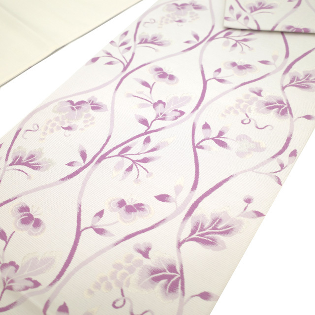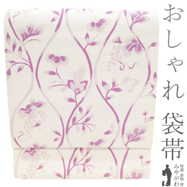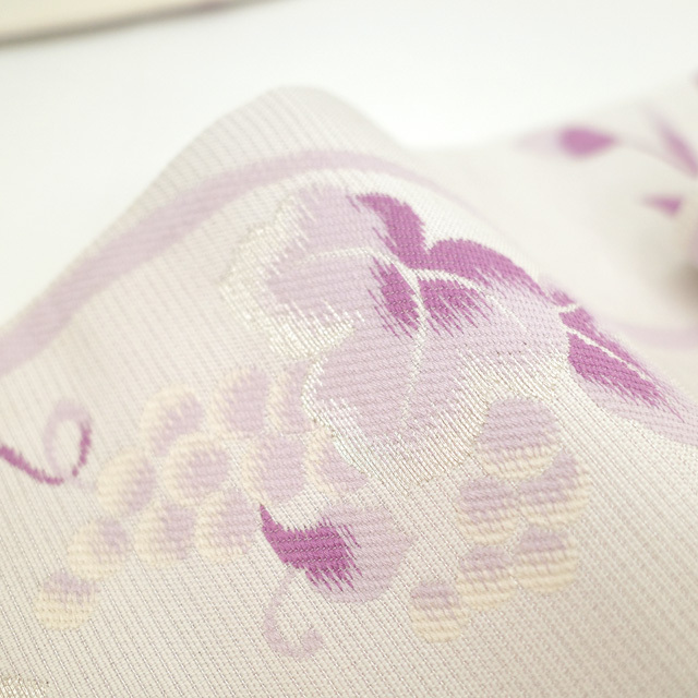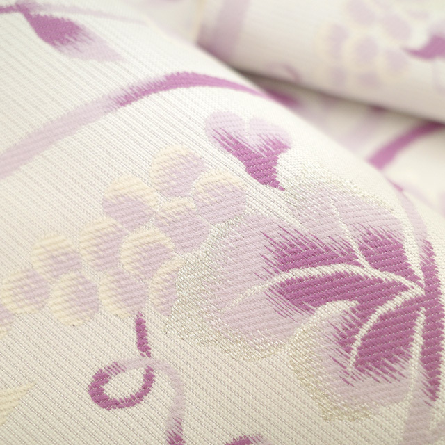 やさしい薄桜色地に、紅紫や薄紫で立涌・葡萄・草花織り出されたこちらの 袋帯 。