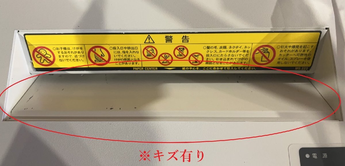 | 状態 | 【中古品】 ◆10枚重ねて裁断テスト済。 ◆逆転ボタン動作確認済。 ※投入口にキズがございます(画像をご参照下さい) ※上記以外の確認はしておりません。 |