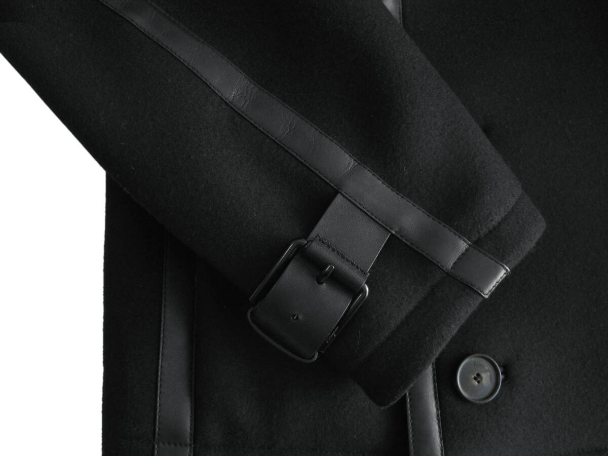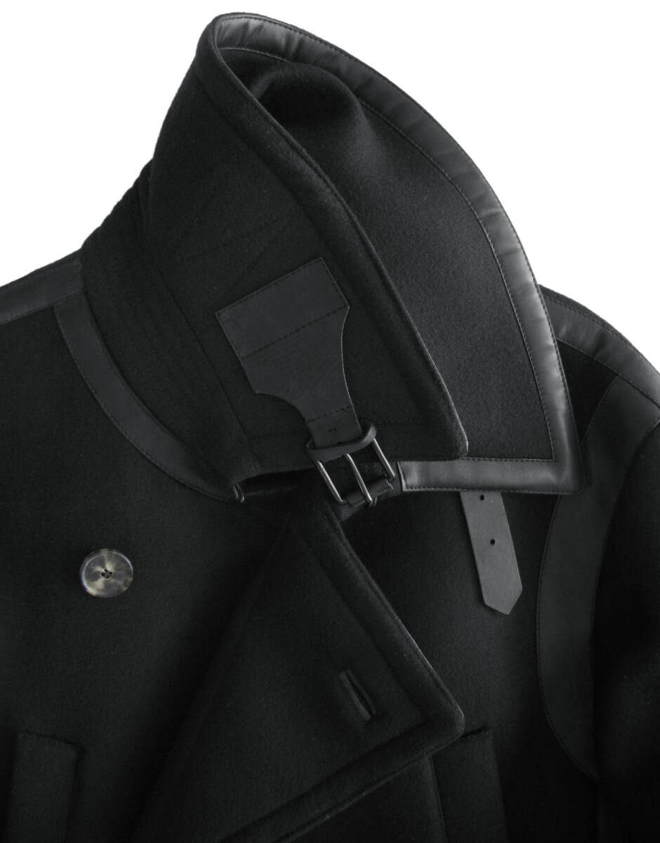 フロントはダブル6つ釦、襟元1つ釦、襟はアルスターカラー、袖口はベルトカフ、ベントはノーベントです。