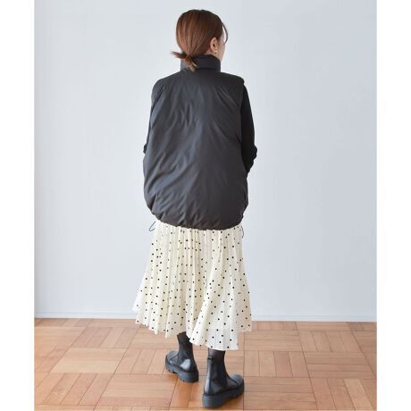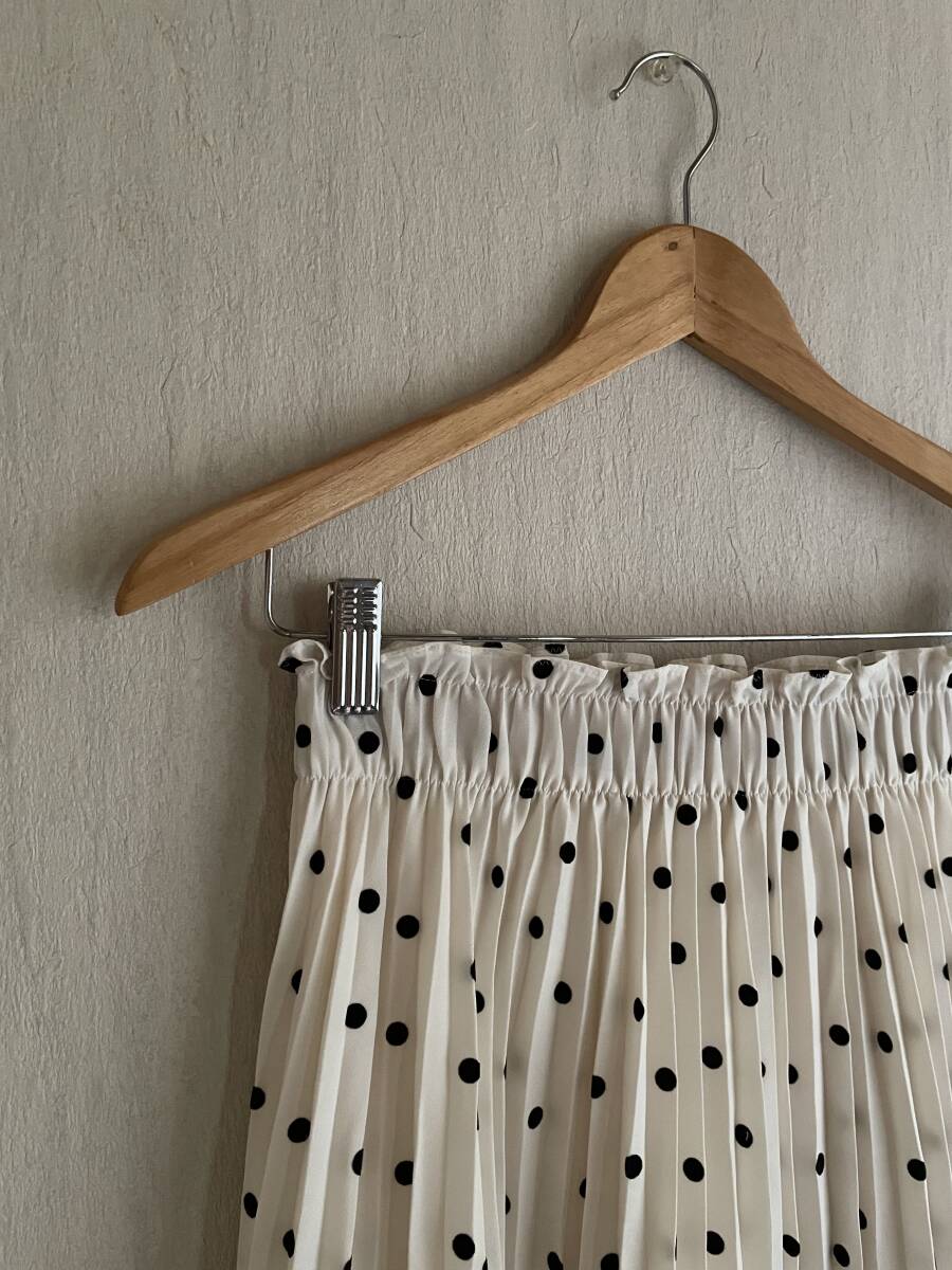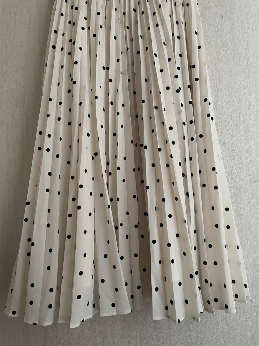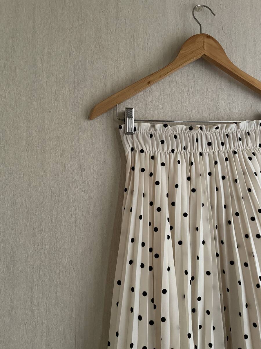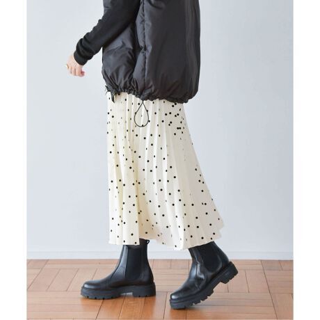女性らしいジョーゼットに、フロッキーでドットのプリントを施しプリーツ加工したスカート。