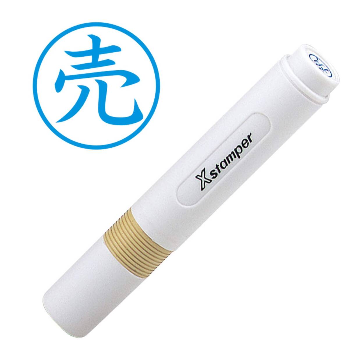 シャチハタの連続して捺せる「Xスタンパー」です。印面サイズは、直径6mm。インキ色は、藍色です。印面内容は、「売」になります。直径6ミリの小さな印面が、簿記事務に最適。帳簿や出席簿などによく使われる82種類の印面をご用意。ポンポン捺せるので、なつ印事務をスムーズにします。