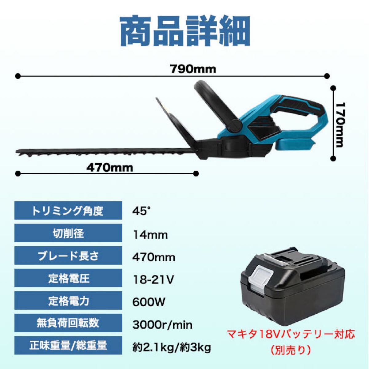 マキタ18Vバッテリーで使用可能なヘッジトリマーです。