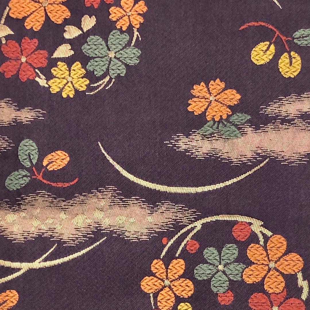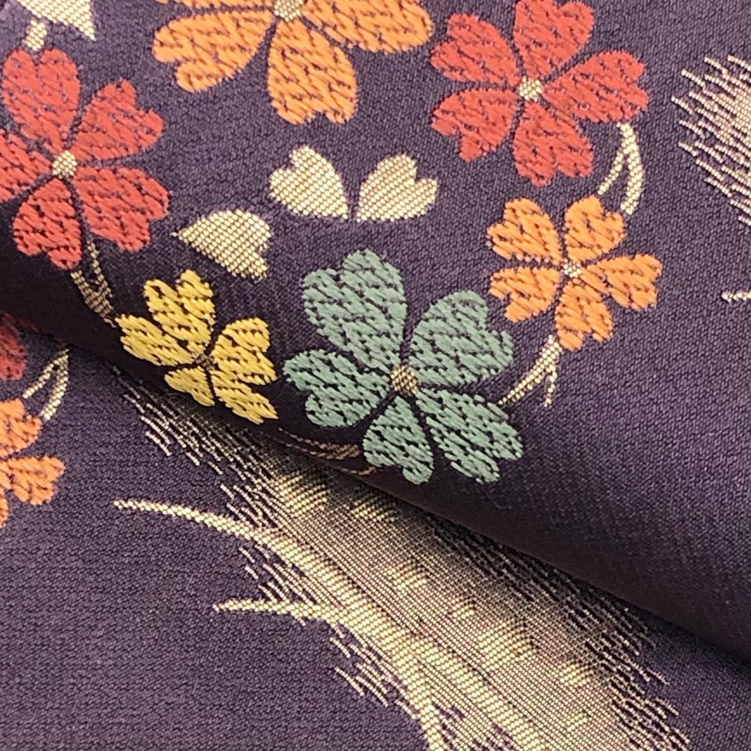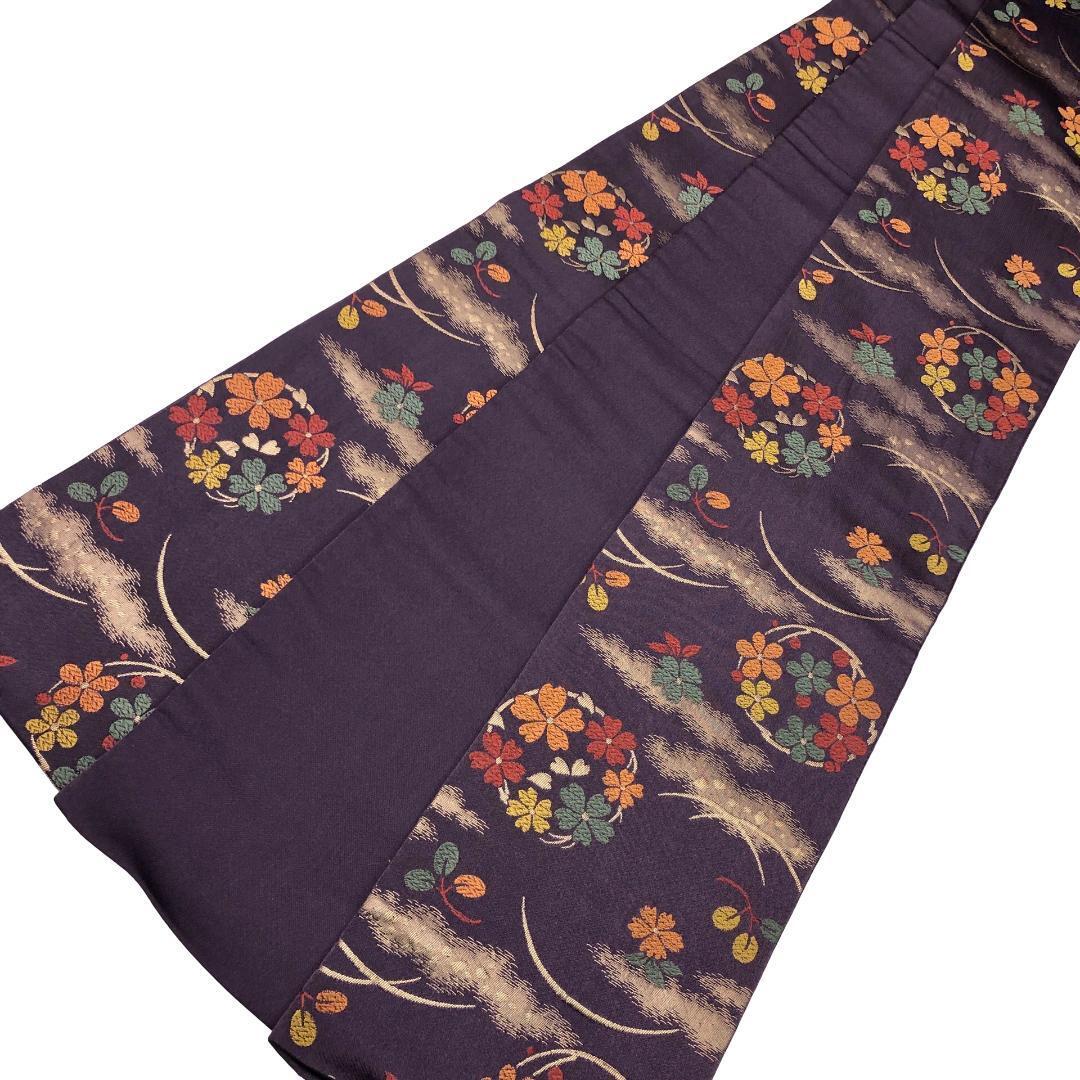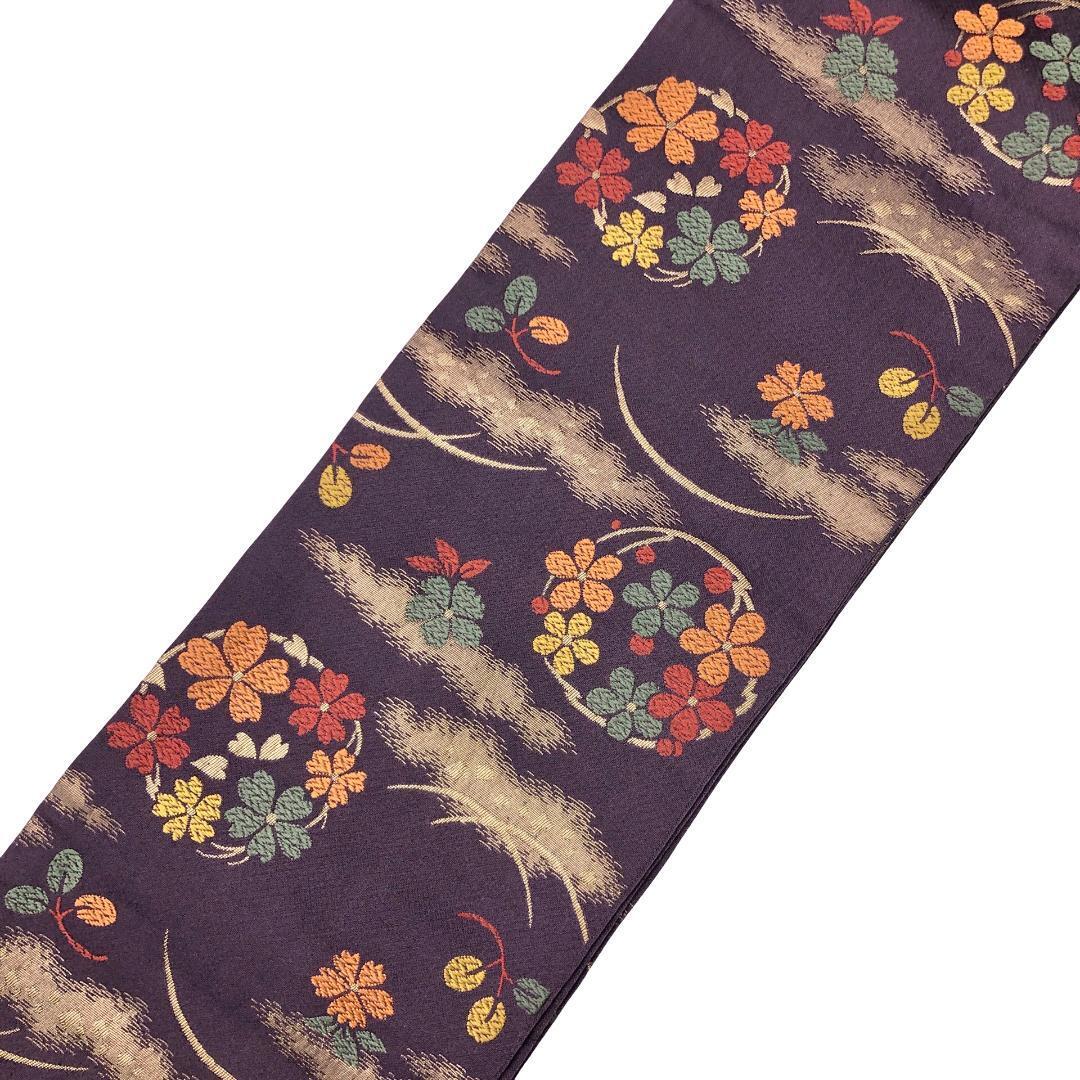 半幅帯 花模様 芝に萩 紫色 金糸 D-2113 着物 きもの kimono 和服 和装 中古 リサイクル着物 【送料無料】