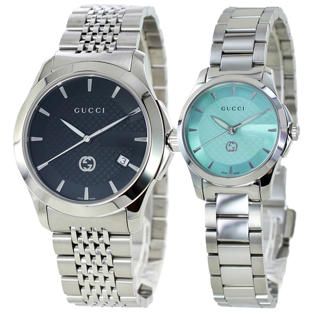 ★★★こちらの商品は、腕時計2本セットのペア商品になります。★★★ペア腕時計ボックス(リングも収納可能)プレゼント中!絆を深めるアイテムとしてカップルに人気の「ペアウォッチ」年齢、シーン、流行問わずにお使い頂けるグッチのおしゃれなペア腕時計です。スイスメイドのムーブメントを採用。高品質で精度の高く、ブランド力以外も魅力的な腕時計です。■ブランド:GUCCI(グッチ)■クオーツ(電池式)■電池交換・ベルト調整について:量販店の時計売り場や最寄りの腕時計店で可能なモデルです。■機能(※メンズのみ):カレンダー(日付)■防水性:日常生活防水■サイズ(約)時計の幅:40mm/28mmベルト腕周り:最長19.5cm/最短12cm~最長17.5cm■文字盤カラー:ブラック/ターコイズブルー■ベルトカラー:シルバー■ブランド専用BOX※ブランドBOXは入荷月によって異なる場合がございます。予めご了承くださいませ。■保証期間:1年間YA1264106/YA1265051旦那プレゼント 妻プレゼント 父プレゼント 母プレゼント 両親プレゼント 男性プレゼント 女性プレゼント 友達プレゼント