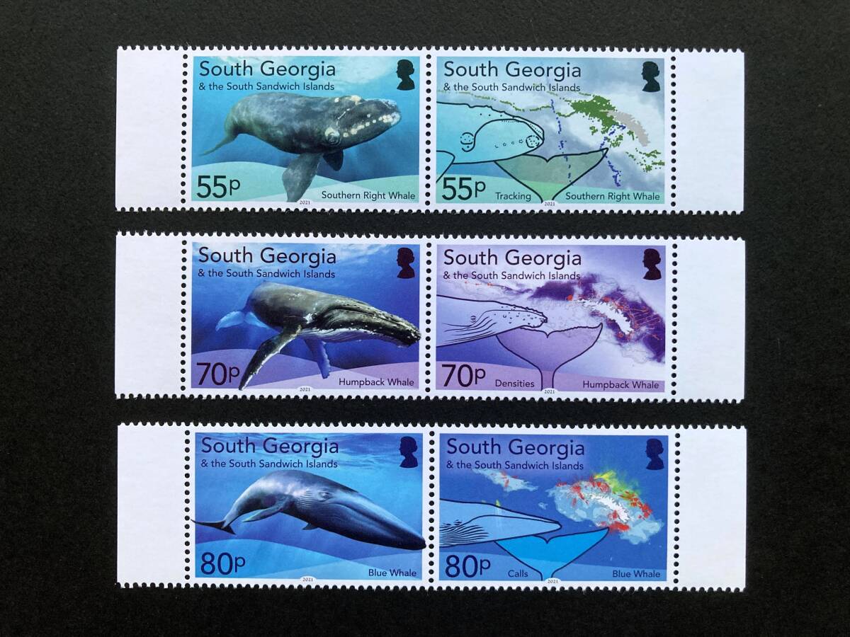 (英国海外領土)サウスジョージア・サウスサンドウィッチ諸島  2021年 発行  「クジラ」 6種完(2種連刷×3)未使用、NH(ヒンジ跡無)、糊付です。