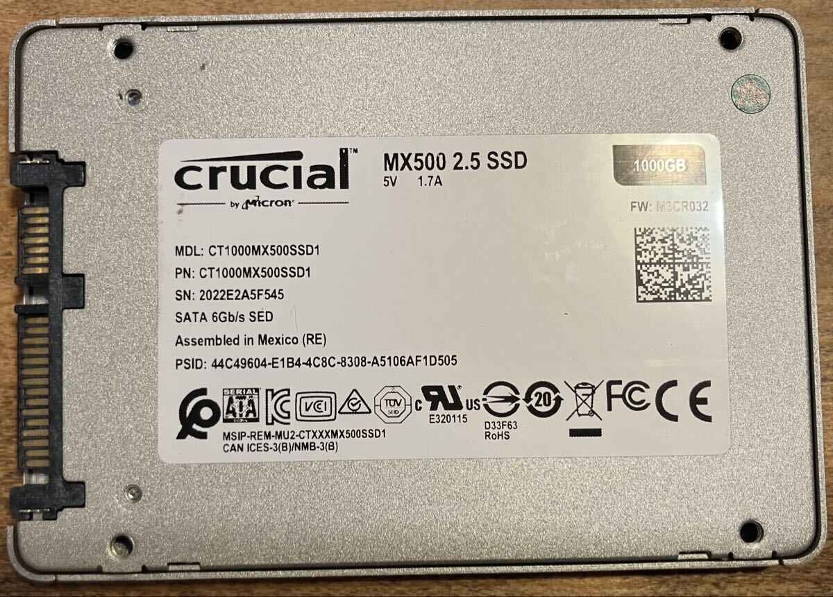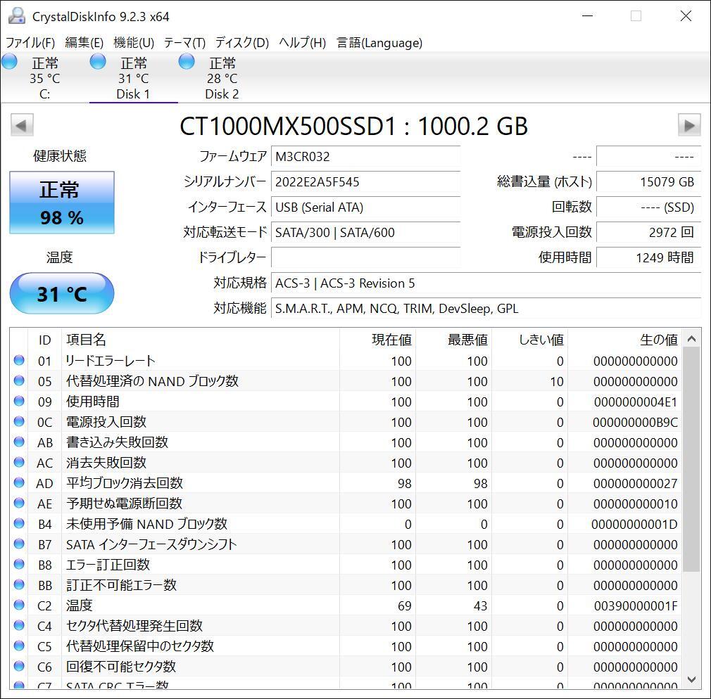 【使用時間1249時間】crucial MX500 1000GB CT1000MX500SSD1 2.5 SATA SSD 292
