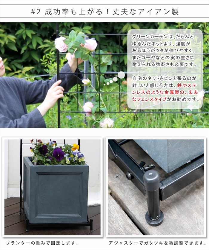 | お庭やベランダが狭くても、ガーデニングは楽しめます。 縦のスペースを有効活用して、プランターやガーデンツールをハンギングしたり、プランターから伸びる薔薇や朝顔、ゴーヤのツルをからませたり。 ハロウィンデコレーションや、クリスマスイルミネーションも飾れますよ。 置いたら即自立! 初心者でも簡単設置OK。 フェンスを組み立てたら、プランターを乗せるだけで設置完了。 狭い空間や土がない場所でも、手軽にガーデニングが始められます。 |