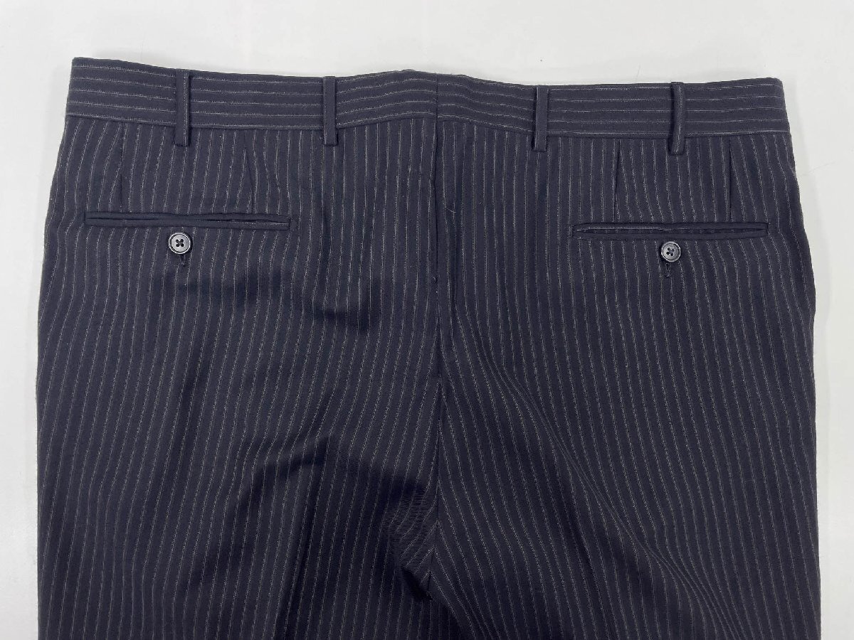 ・スラックス・・・ウエスト実寸約96センチ(0センチ出し、4センチ詰め可能)、股上約29~30センチ、渡り幅約36センチ、股下約80センチ、総丈約107センチ、裾幅約22.5センチ、ダブル仕上げ(ダブル幅約4センチ、最大でプラス8センチ長くできます)