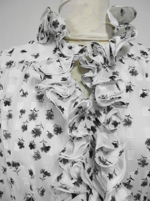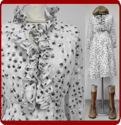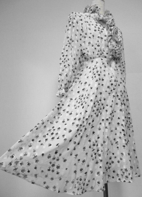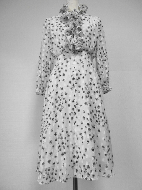古着♪レトロ・Vintage白花柄フリルワンピ♪70s60s70年代60年代80年代ヴィンテージ昭和モダン衣装式アンティーククラシカル長袖日本製即決