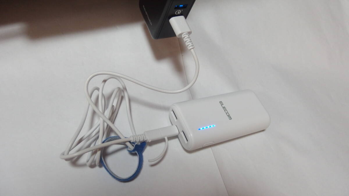 ・DE-C23L-6700WF  のINにUSB Type-Cケーブルを接続し、100%まで(4つのLEDが点灯して、その後消灯した)充電が行えた。
