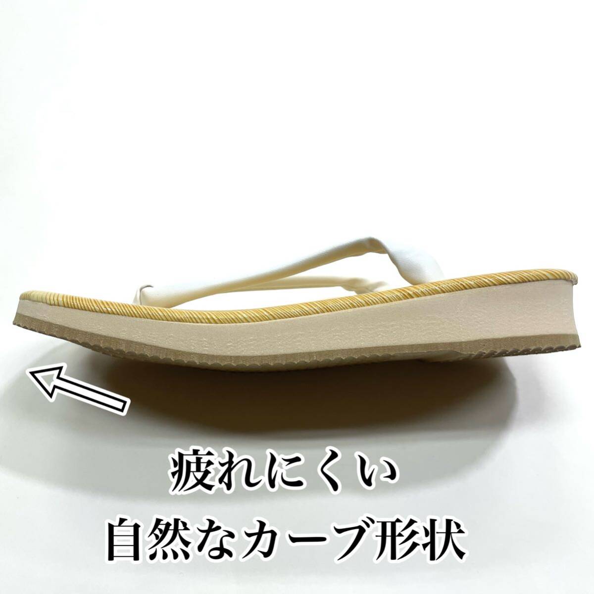 こちらの草履は足の裏と同様自然なカーブ形状となっているので「スニーカーのように母指球を中心に体重移動」ができ、特に一番スリ減りやすいカカト部分のソール厚みが約4~5mmもあるので、普段履きや長時間の踊り用としてはもちろん、その耐久性の高さからお寿司屋さんや天ぷら屋さんなどの飲食店の方からも人気な【日本製の草履】となっております。