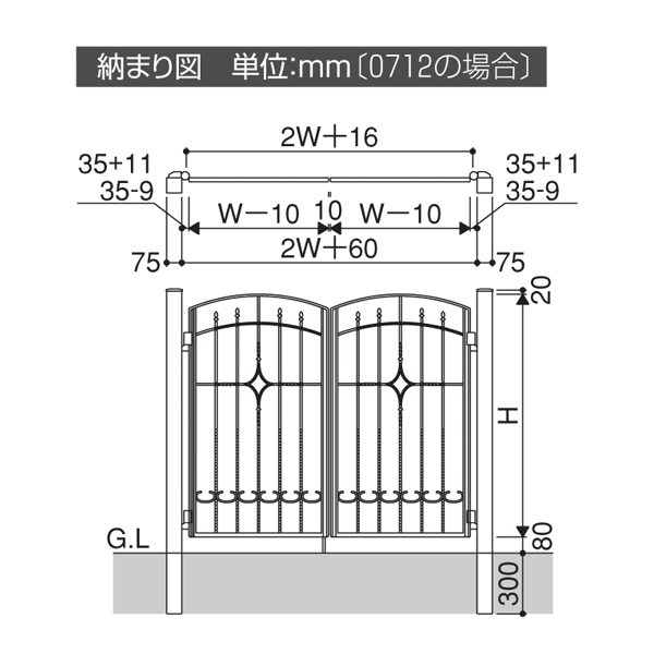 | 仕様・サイズ | 全幅181cm(扉80cm×2)X高さ100cm ▼通常仕様 ・扉の開閉方向:内開き(家側へ開く)仕様 ・打掛け錠 (外/内:簡易錠) | |