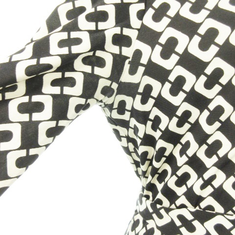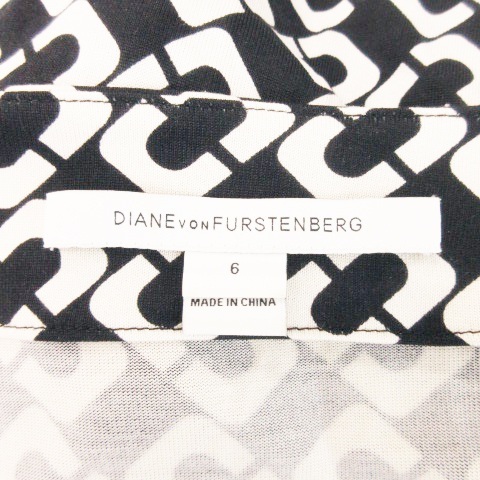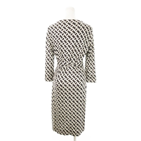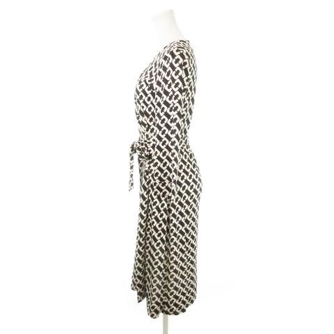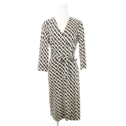 ダイアンフォンファステンバーグ ワンピース カシュクール ミモレ ロング 七分袖 絹 シルク ストレッチ リボン 幾何学 総柄 6 M 黒