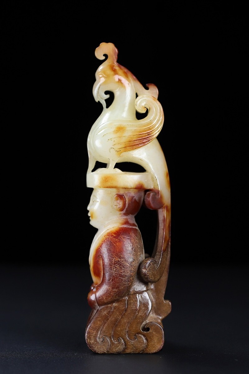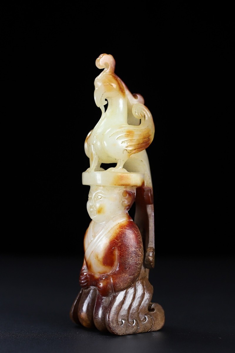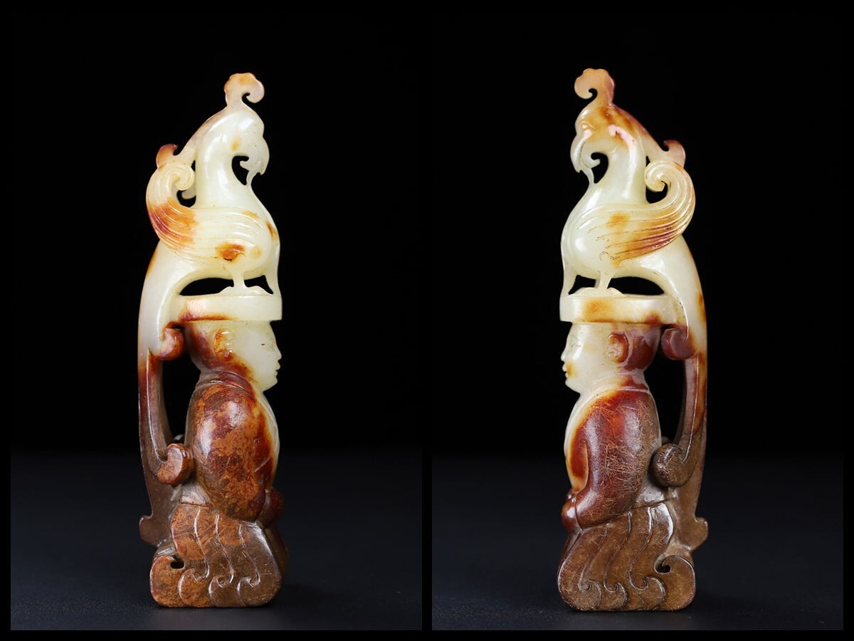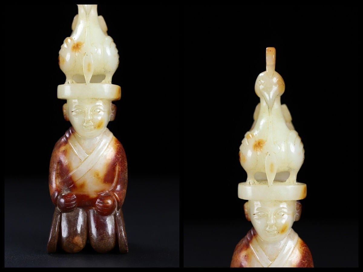「時代物 和田玉 高古玉彫り 跪人鳳鳥」極細工 擺件 中国古賞物 古美術 旧蔵出