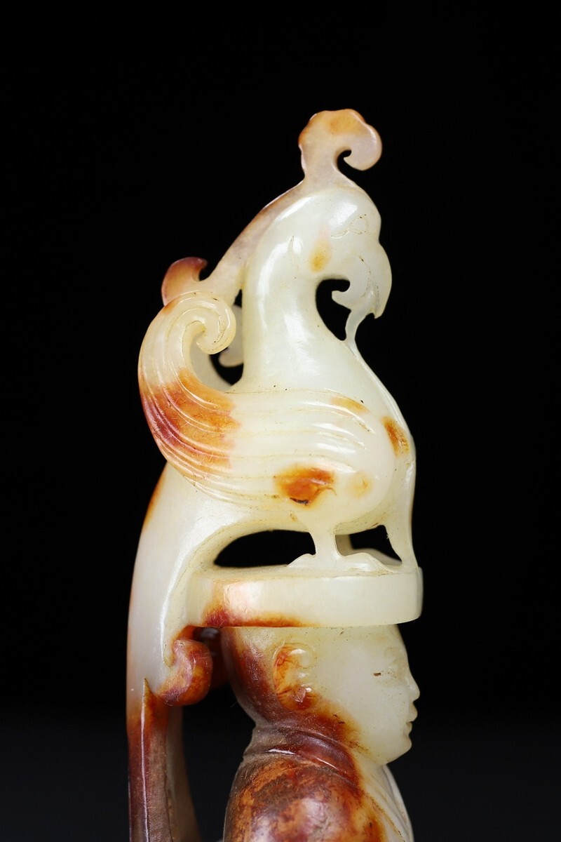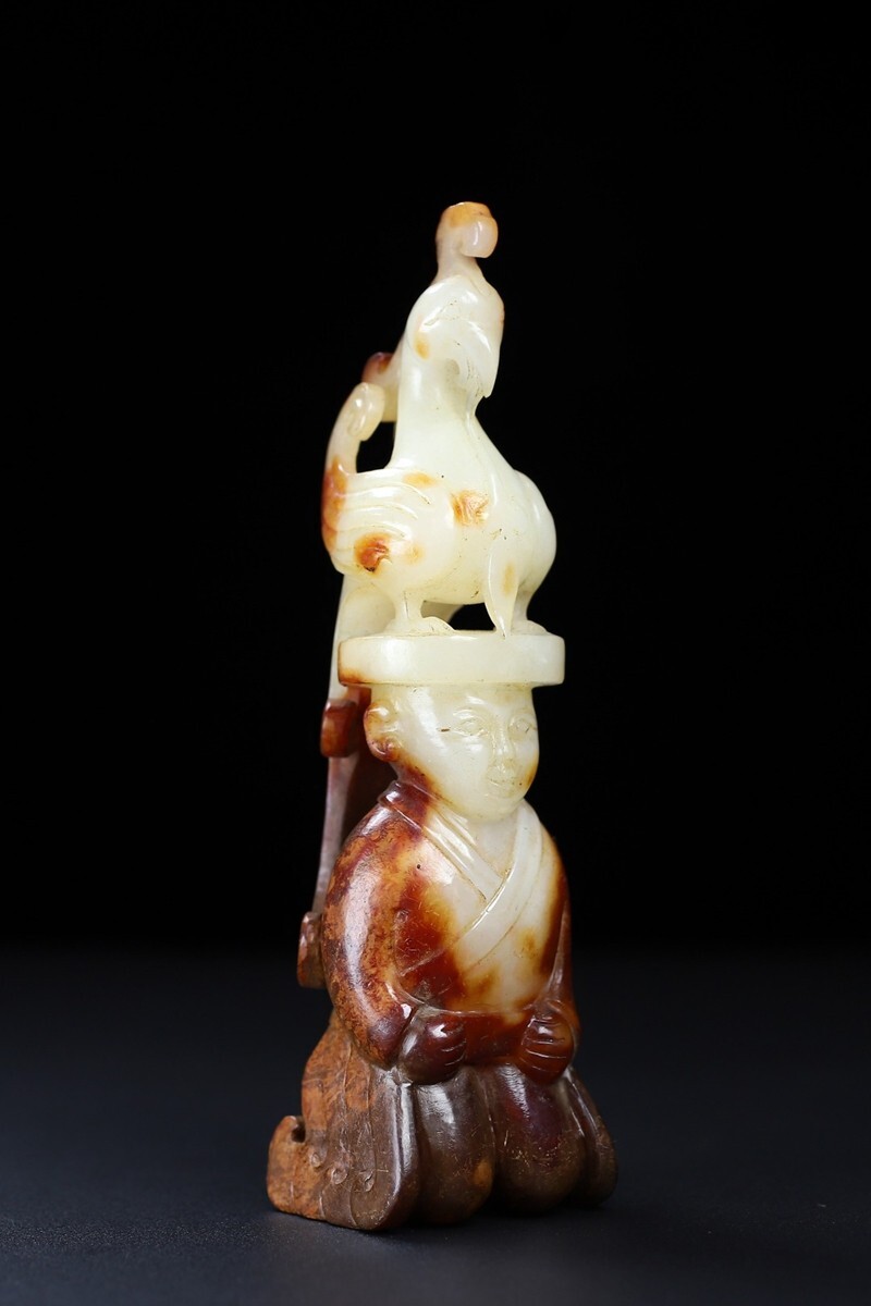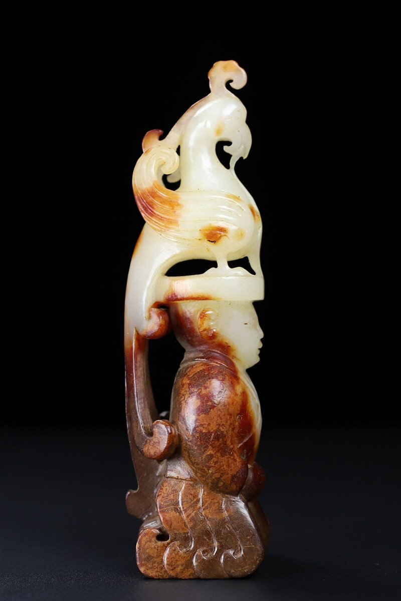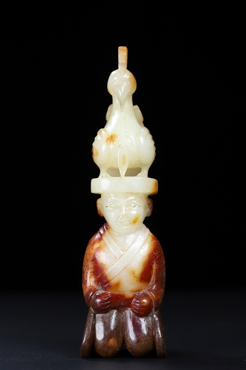 「時代物 和田玉 高古玉彫り 跪人鳳鳥」極細工 擺件 中国古賞物 古美術 旧蔵出
