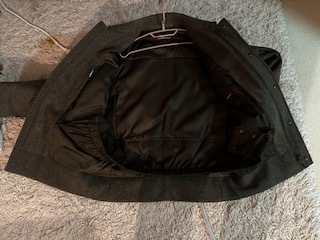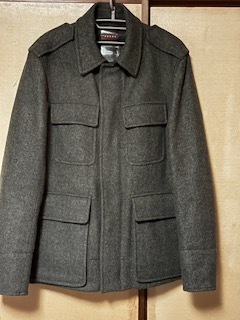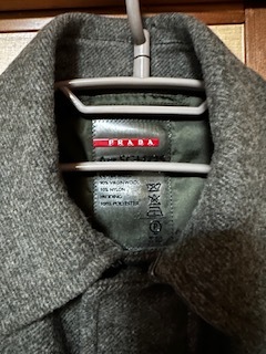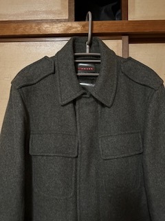 PRADA ウール素材のミリタリー風カーキコート、ポケット付きで実用的。 - 色: カーキ - デザイン: ポケット付き - 素材: ウール - 襟のデザイン: スタンドカラー - スタイル: ミリタリー風 ご覧いただきありがとうございます。 肩幅/身幅/袖丈/着丈 身幅...54cm 着丈...75cm 汚れ・破れ・臭いなど...なし カラー...カーキ系