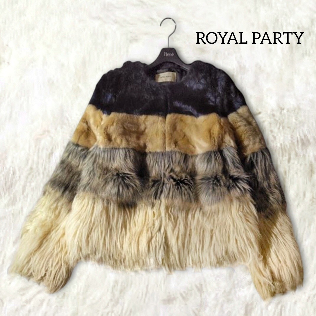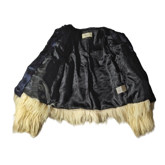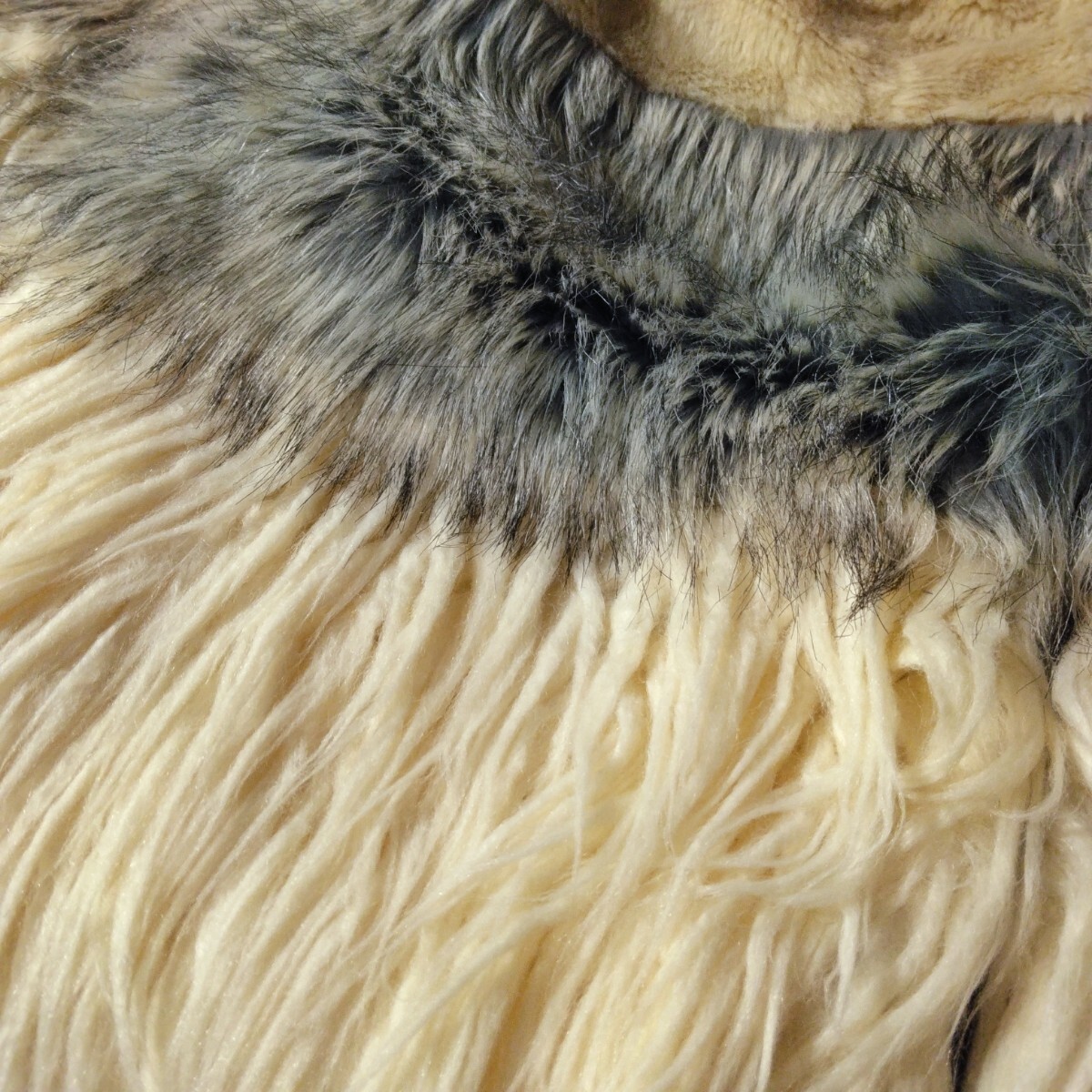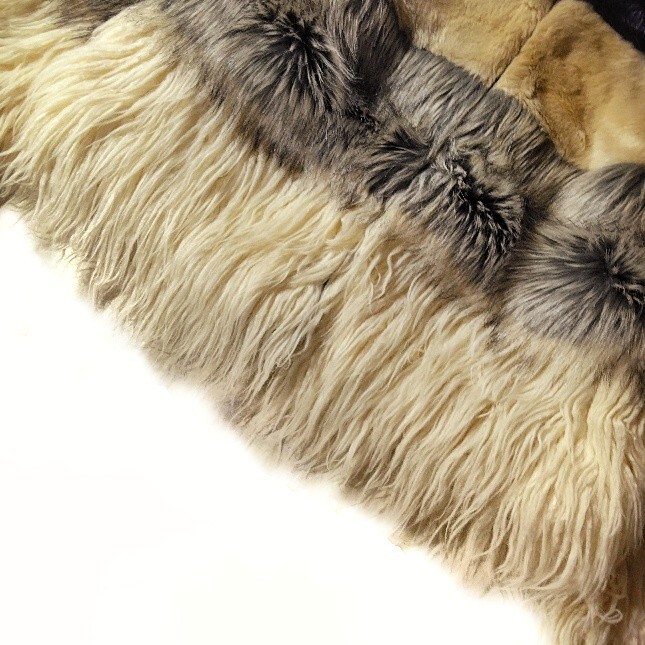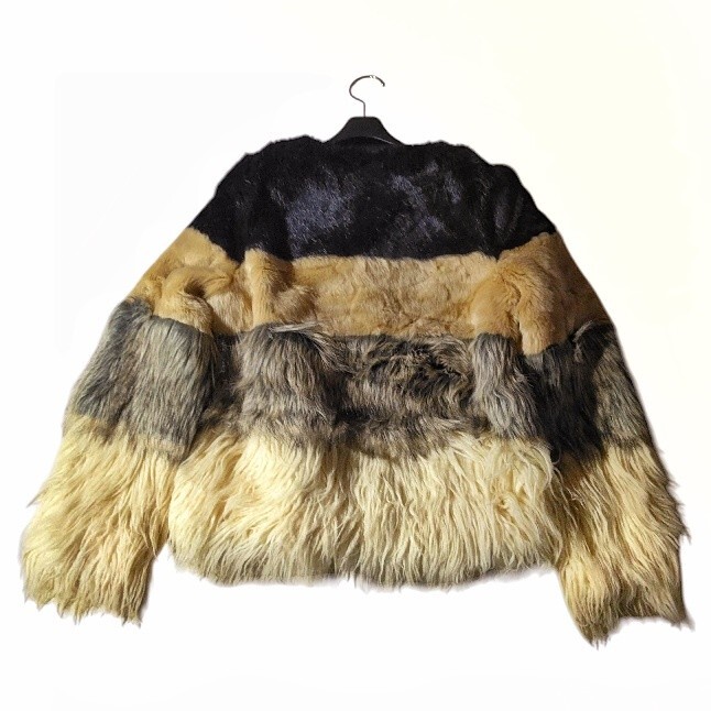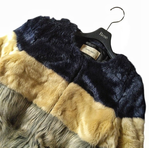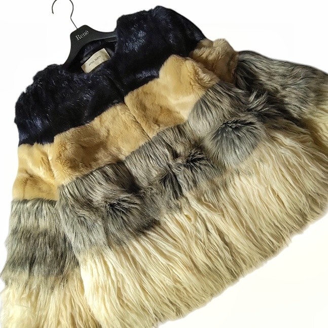 様々な質感のフェイクファーが段でデザインされたコートになります