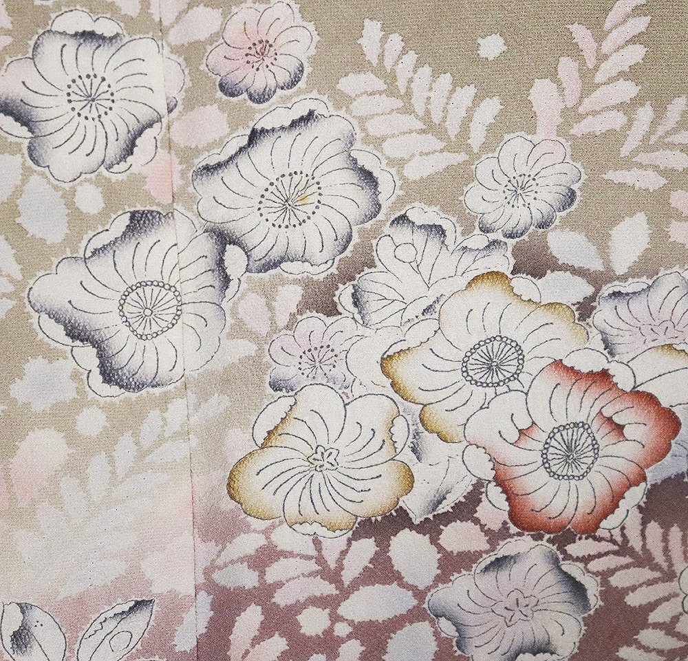 辻が花訪問着 袷 丹後縮緬地 薄赤紫(浅蘇芳色)・薄緑(空五倍子色)・暈し地 絞り・辻が花 (写真では上手く色が出ない場合があります。ご了承下さい) |