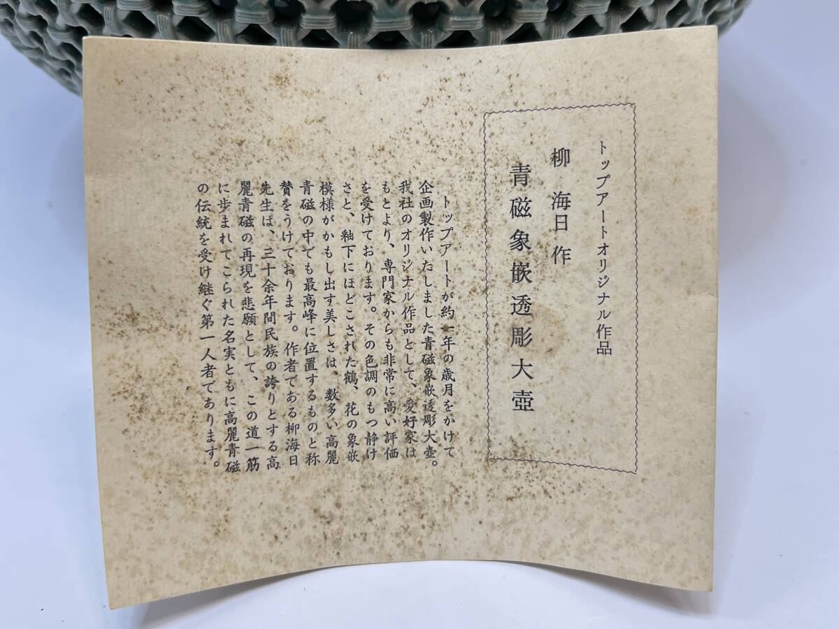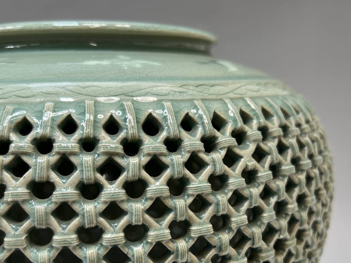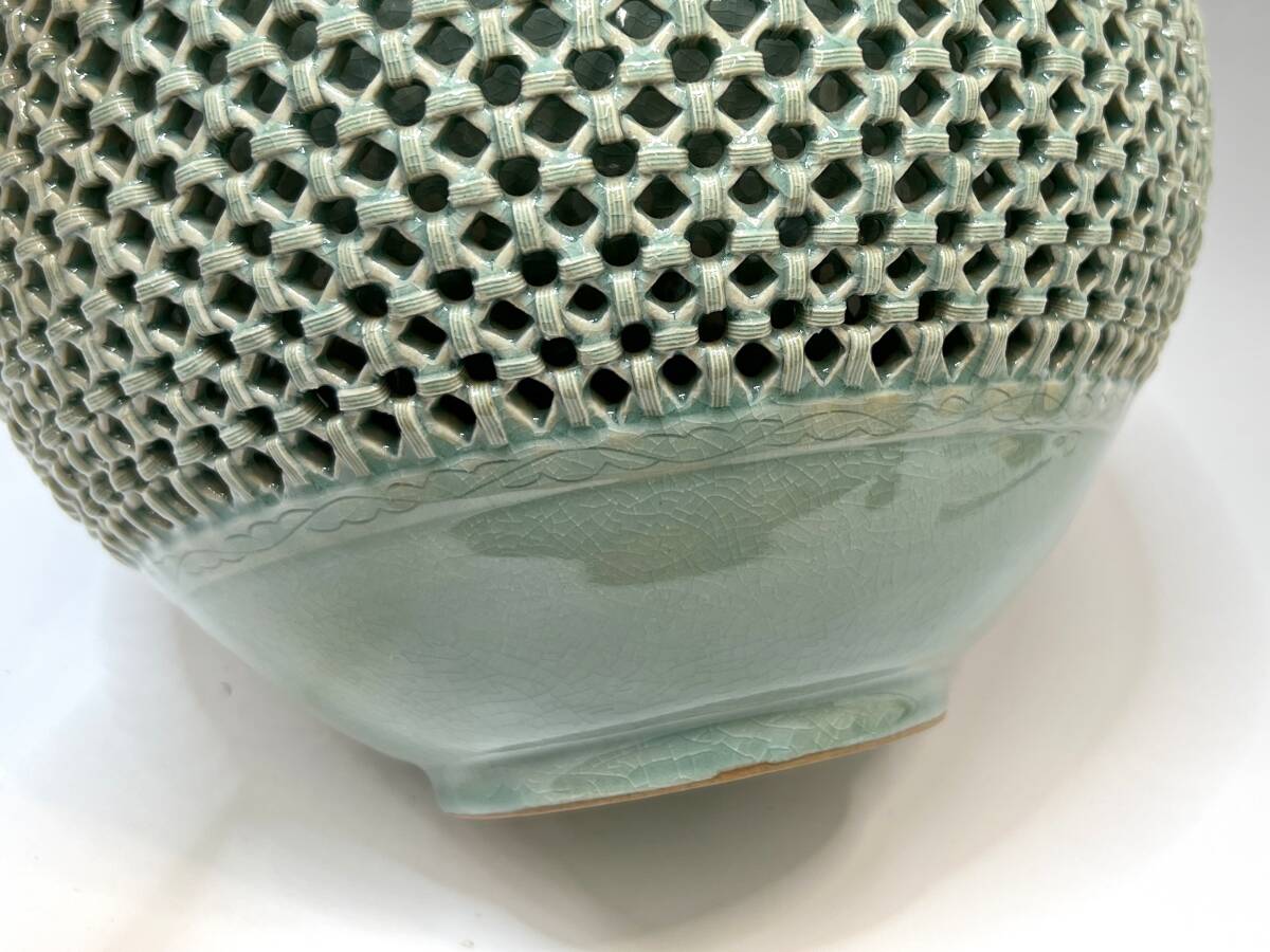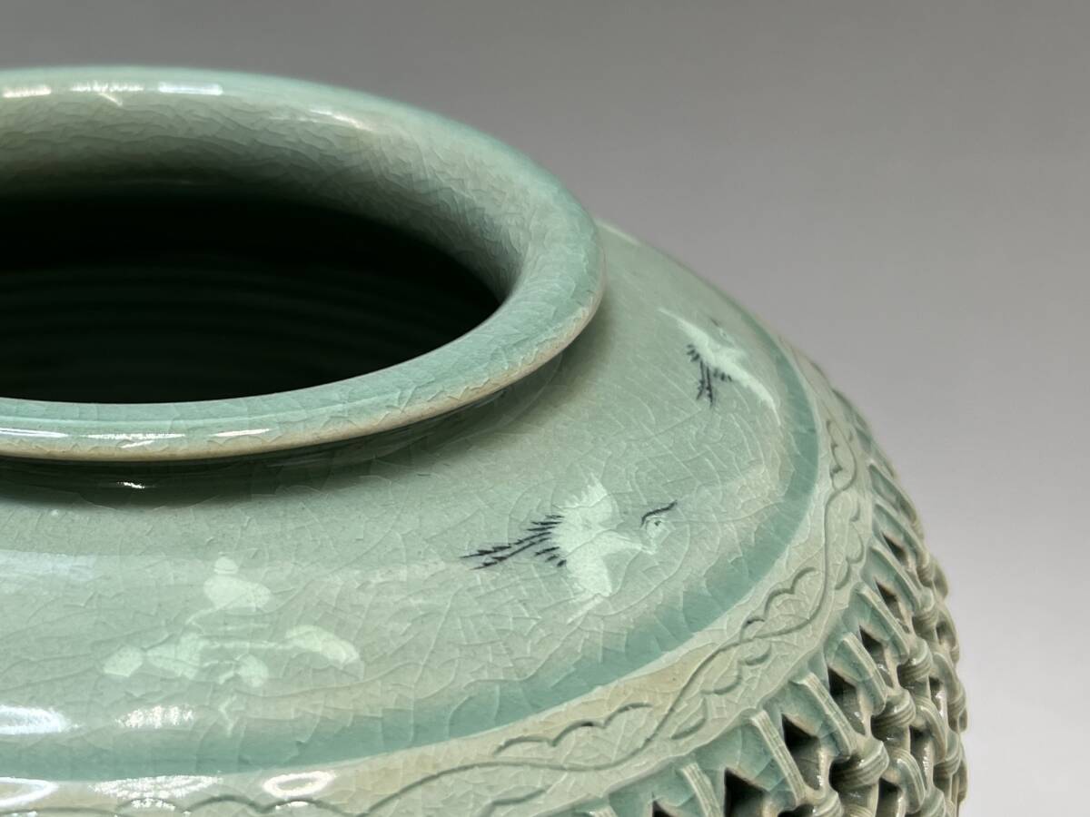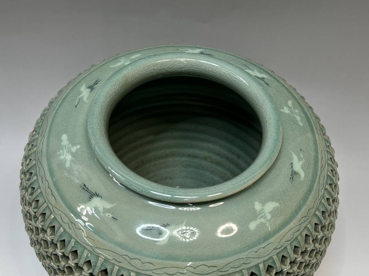 高麗青磁象嵌透彫大壷 柳海日 柳昌坤 雲鶴文 直径29cm 高さ23.5cm 韓国美術 工芸 壺 花器 花瓶 F
