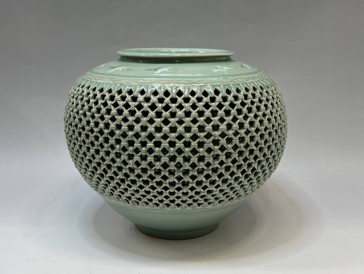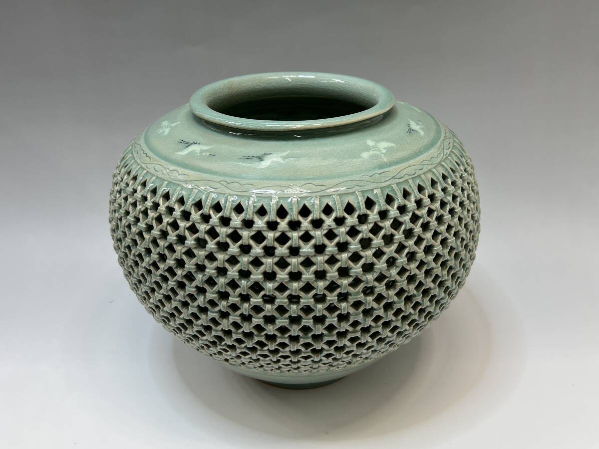 高麗青磁象嵌透彫大壷 柳海日 柳昌坤 雲鶴文 直径29cm 高さ23.5cm 韓国美術 工芸 壺
