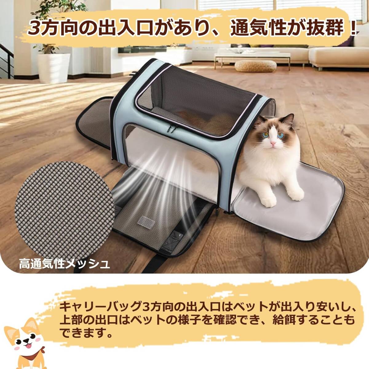 • 【通気性が抜群・広い空間】四方向すべてに高品質メッシュ素材の窓を搭載。ペットが中から周囲を見渡せる設計で、閉塞感を与えず快適。通気性が非常に良く、夏でも蒸れにくくなっています。また、メッシュ部分には耐久性の高い素材を採用しており、ひっかきにも強く安心です。旅行中や動物病院への移動中も、ペットが落ち着いて過ごせる快適空間を提供します