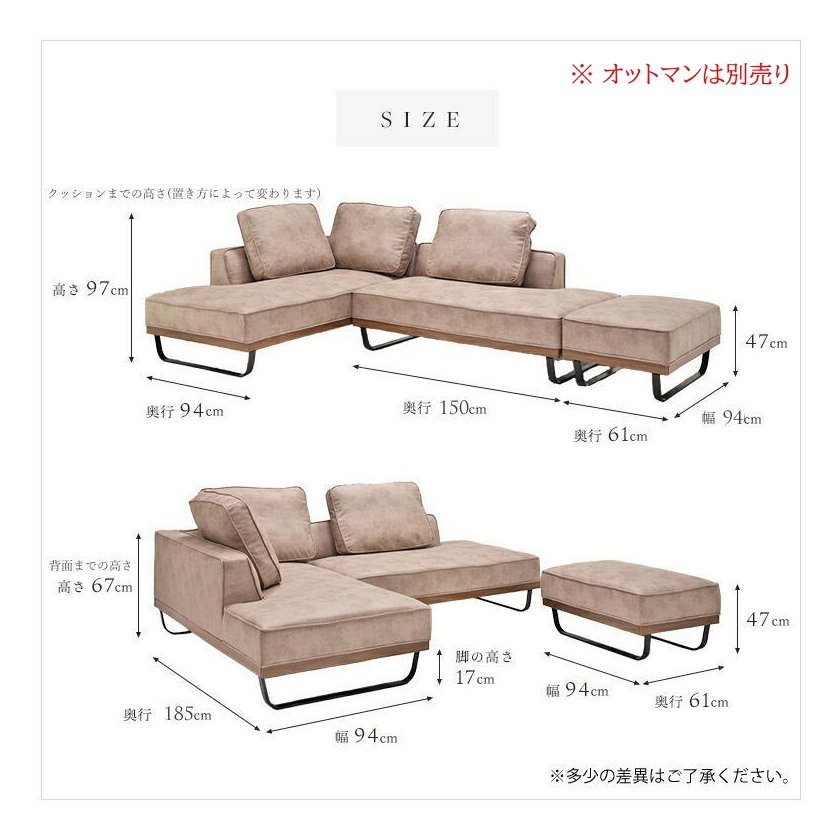 | ◆ サイズ | 2人掛け:W150 × D94 × H97 (SH47) カウチ:W93 × D185 × H97 (SH47) |