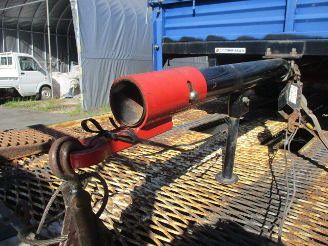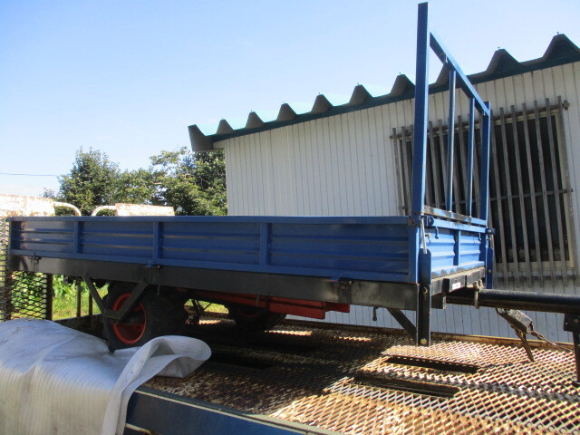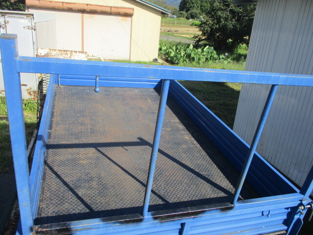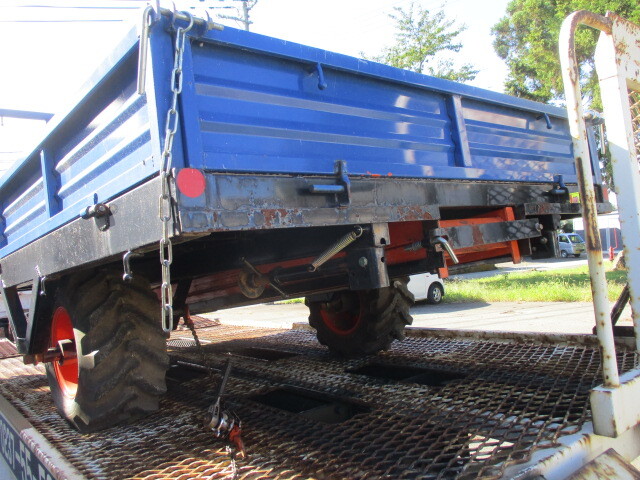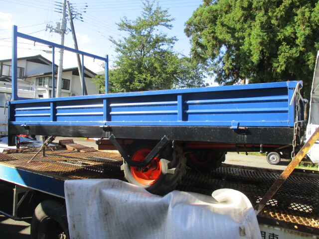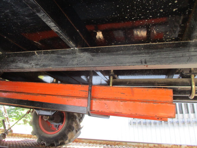 荷台寸法は大体内寸で263X153くらいです。積載量は不明ですがタイヤは22X10.00ー10 12プライというワイドタイヤを履いています。床下には橋板?が収納されています。取り出して点検はしていませんが錆も少なく程度は良いように思えます。全体的にも錆は少なく使用頻度も少なかった品物のように私には思えます。一枚目に写ってるロープは値札を固定したものです。
