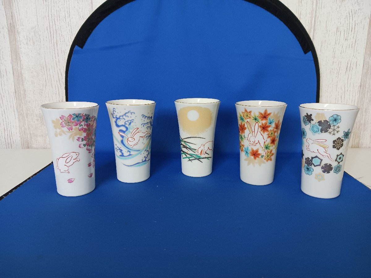 ○●○九谷焼 九谷暁堂 春夏秋冬月夜 ウサギ湯呑揃 5客セット(現状品)○●○