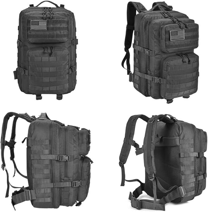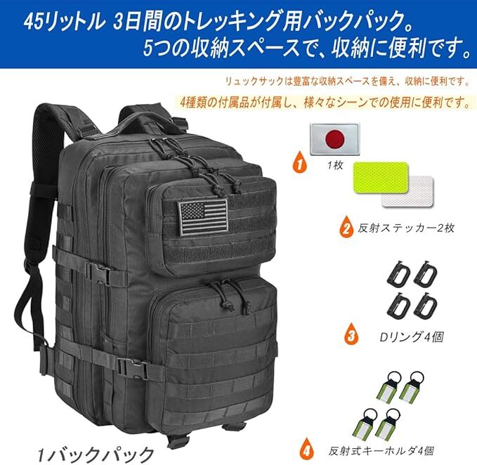 ブラック色 45リットルミリタリーリュックサック、タクティカルバッグ、登山アウトドアキャンプハイキングバックパック