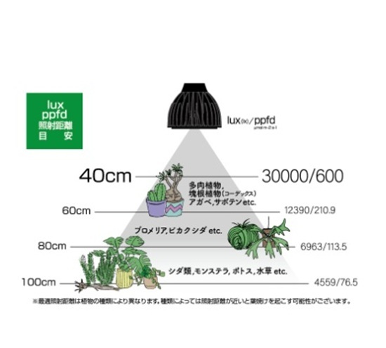 | ppfd | 303?mol m-2 s-1 光合成光量子束密度 ※照射距離40cmの場合 |