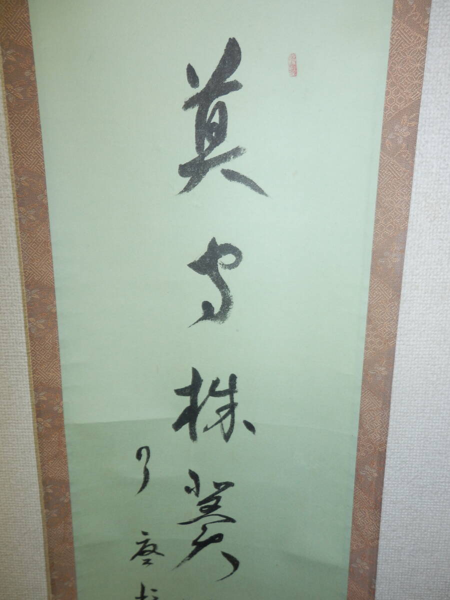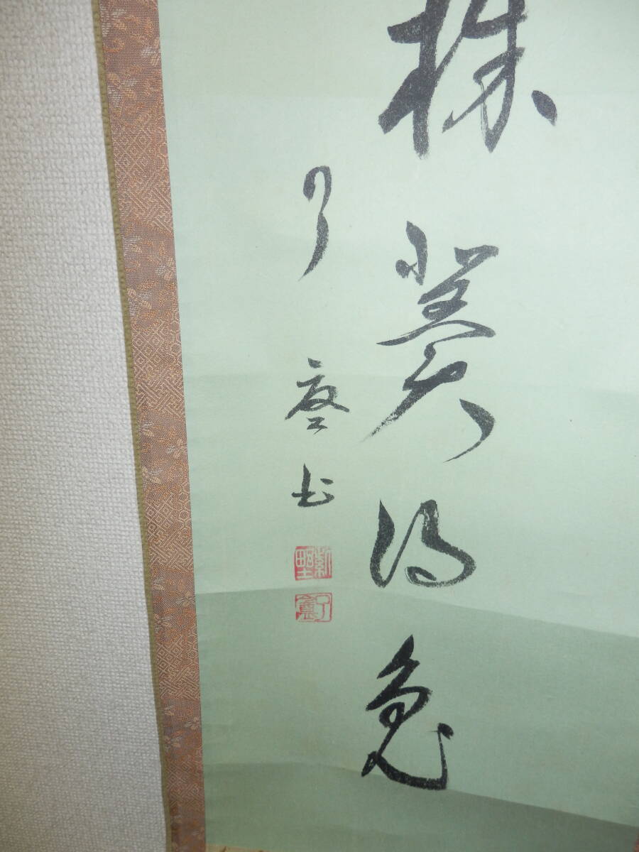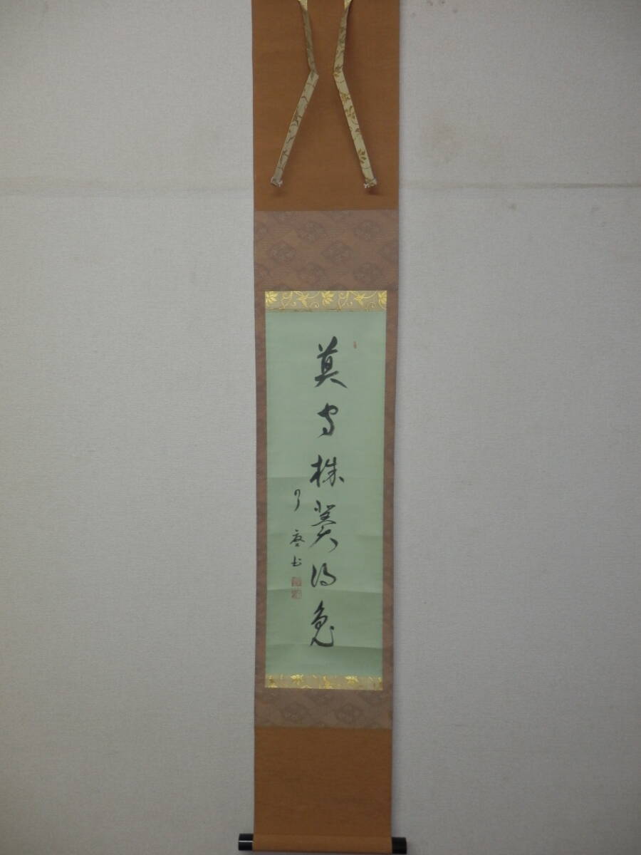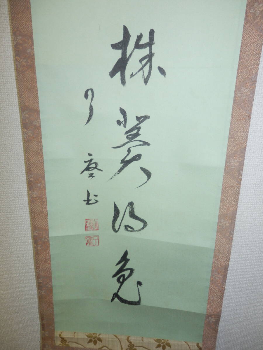 「中古品・掛軸」 大徳寺の徳禅寺の橘 了庵{宗義}師筆の一行書の掛軸です。 「莫守株冀得兎」です。 シミ、折れ等有。 軸幅約27.5cm 長さ約138cm 桐共箱「ヤケ、シミ等有」。 『真作保証・真作でないと証明された場合は返品を承ります』。どうぞ宜しく。